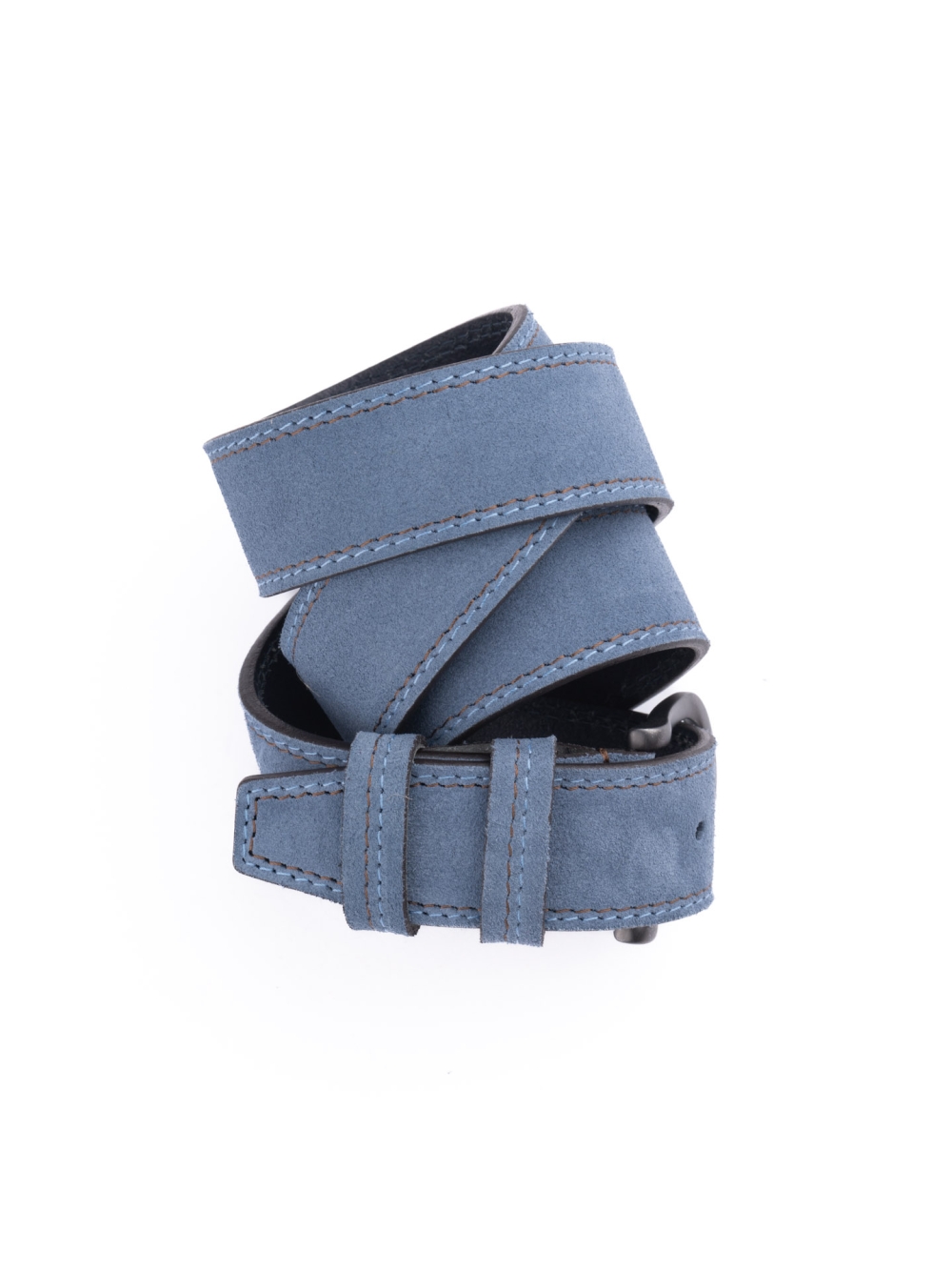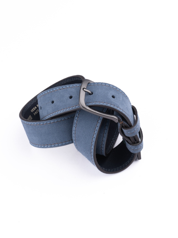 Cintura uomo in camoscio nelle varianti colore moro, sabbia e avio, con doppia impuntura a contrasto.
