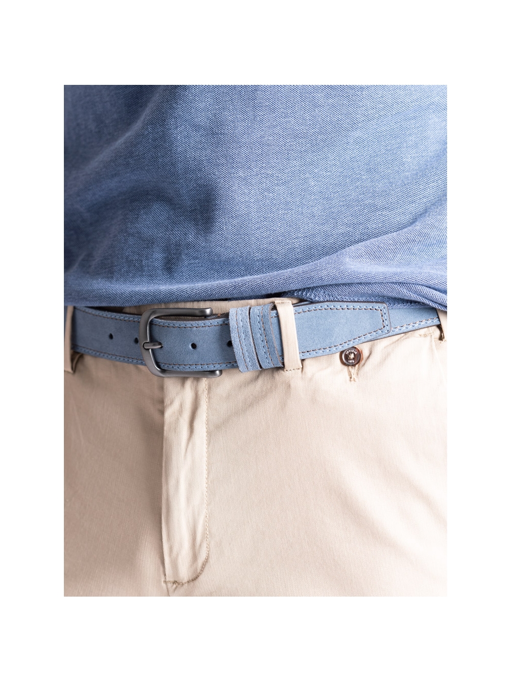 Cintura uomo realizzata in morbido pellame naturale di camoscio con doppia impuntura a contrasto, disponibile nelle varianti colore moro, sabbia e avio.
