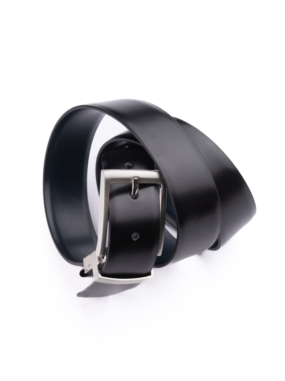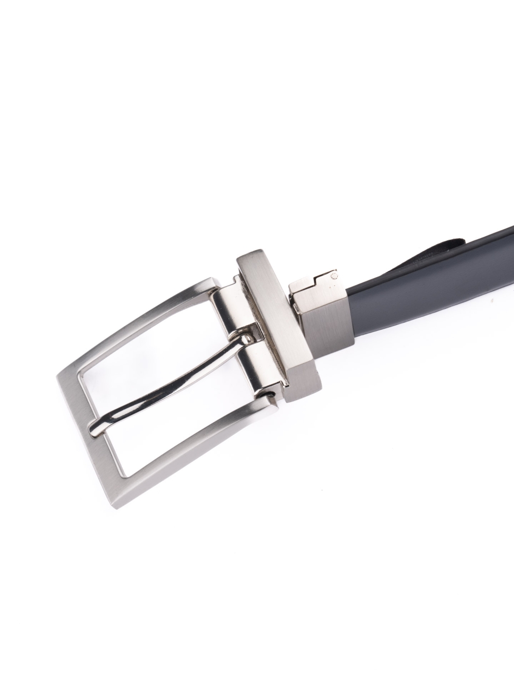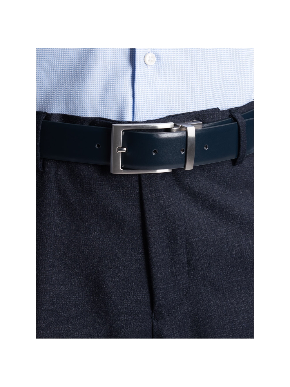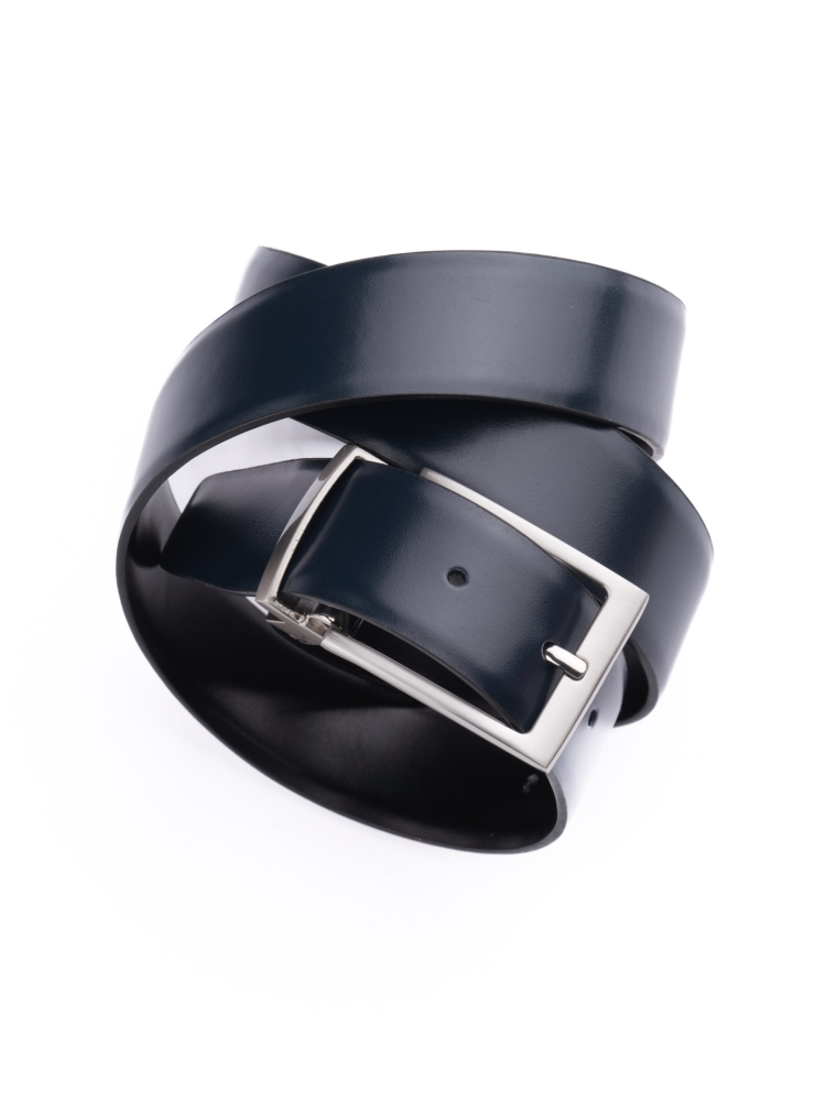 Cintura uomo realizzata in morbida pelle spazzolata reversibile senza cuciture, disponibile nelle varianti colore blu-nero, blu-moro e blu-bianco.