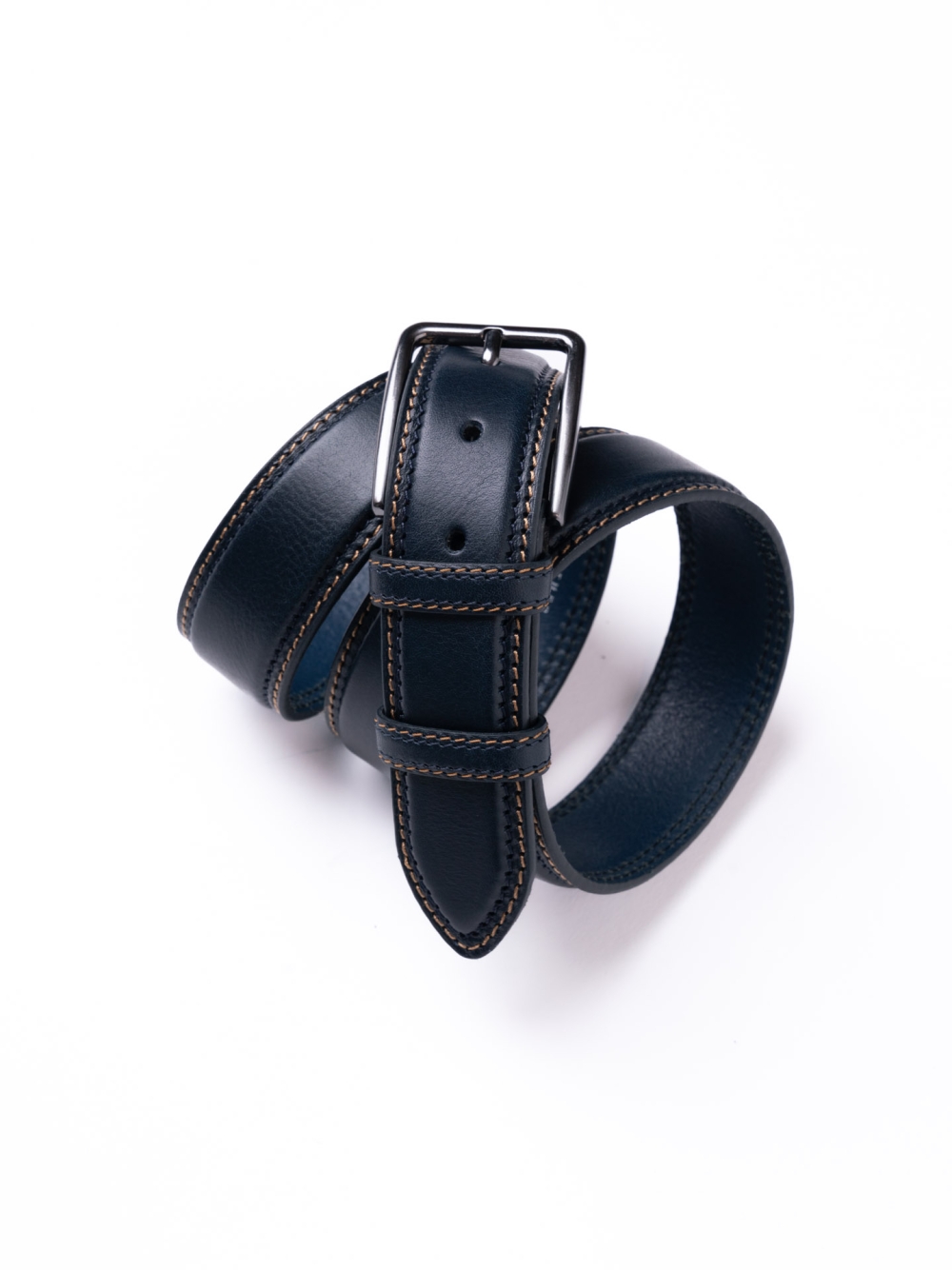 Cintura uomo realizzata in pura pelle con doppia cucitura, una tono su tono e una a contrasto, e fibbia con finitura canna di fucile. Disponibile nelle varianti colore moro, blu e nero.