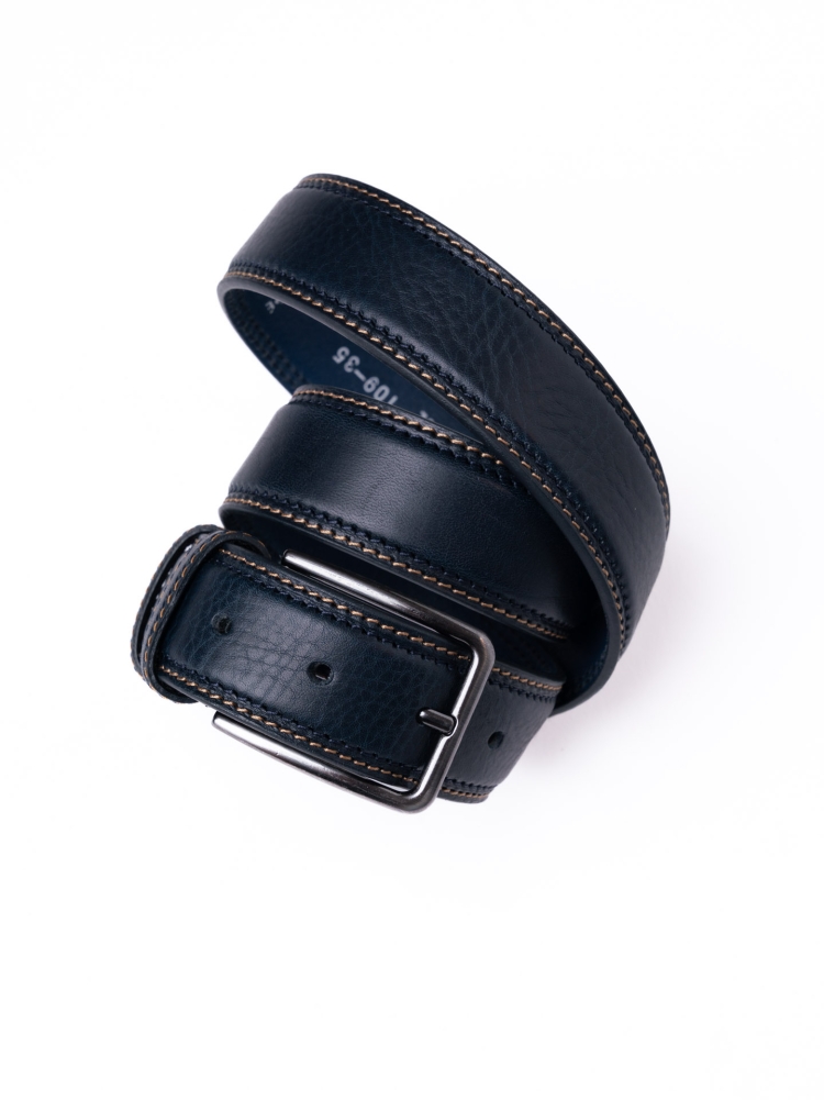 Cintura uomo realizzata in pura pelle con doppia cucitura, una tono su tono e una a contrasto, e fibbia con finitura canna di fucile. Disponibile nelle varianti colore moro, blu e nero.