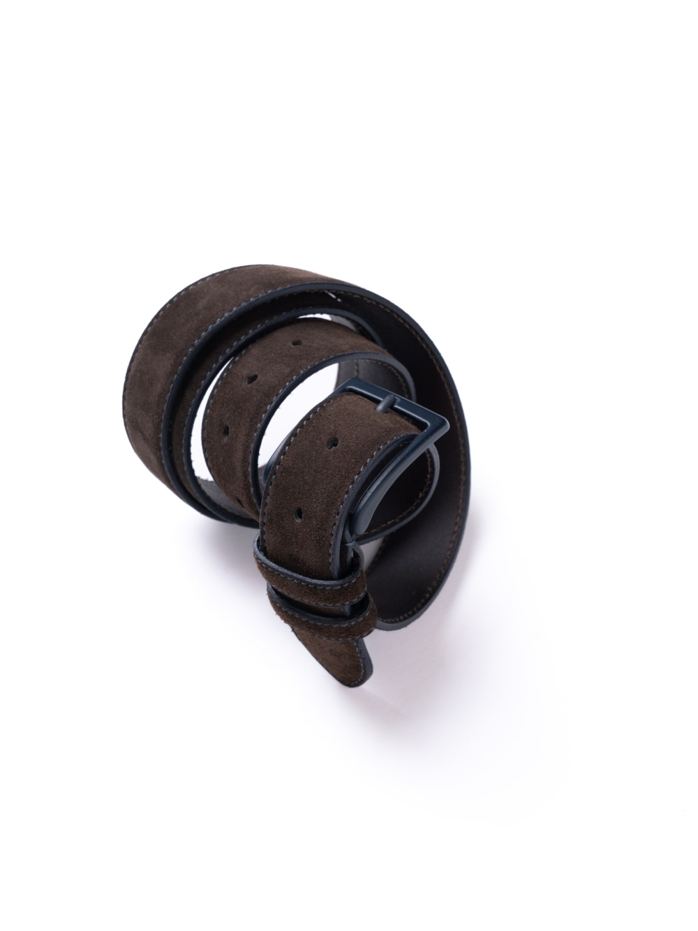 Cintura uomo in camoscio con cuciture tono su tono, passanti e fibbia a contrasto.