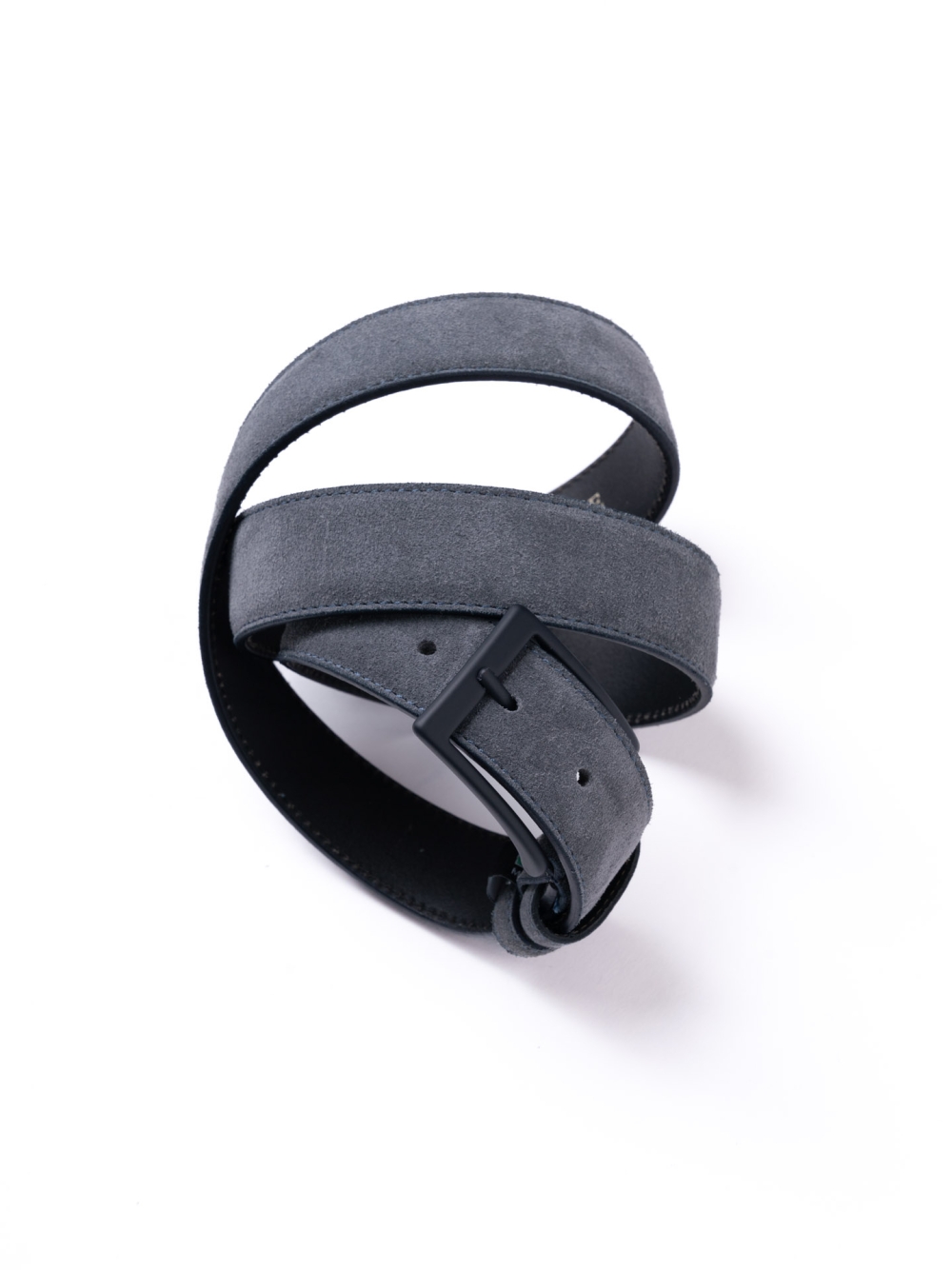 Cintura uomo in camoscio con cuciture tono su tono, passanti e fibbia a contrasto.