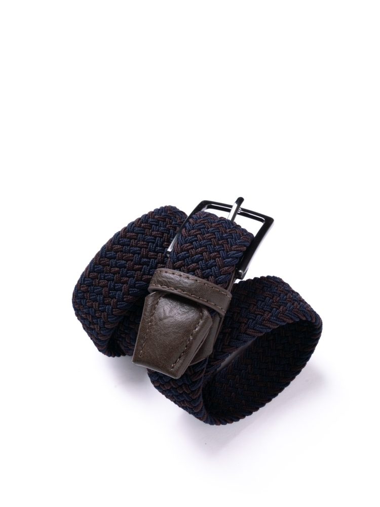 Cintura uomo in nastro elastico con treccia multicolore, puntale in pelle e fibbia canna di fucile, disponibile nelle varianti moro-blu, tortora-avio-verde e nei toni del grigio.