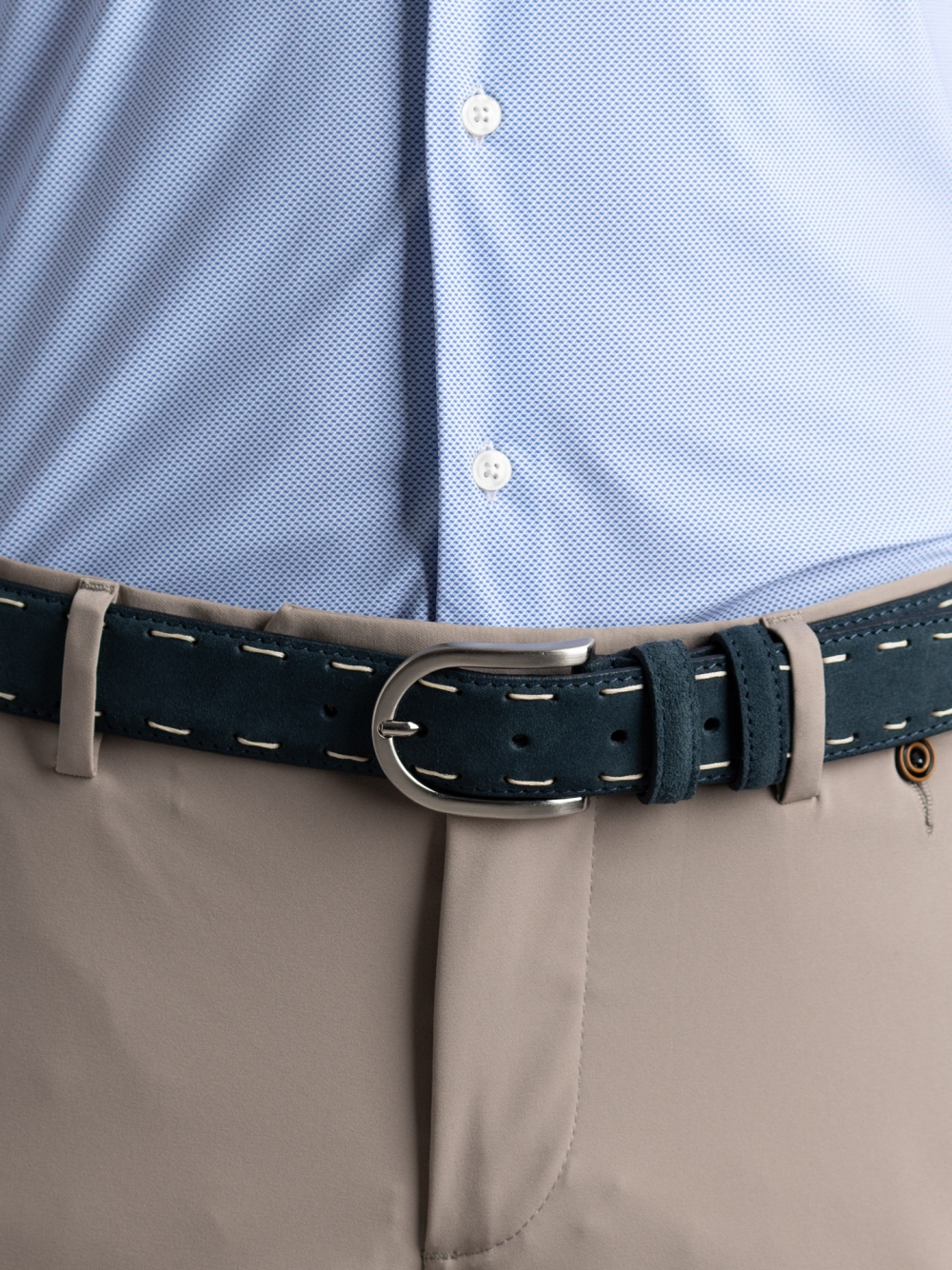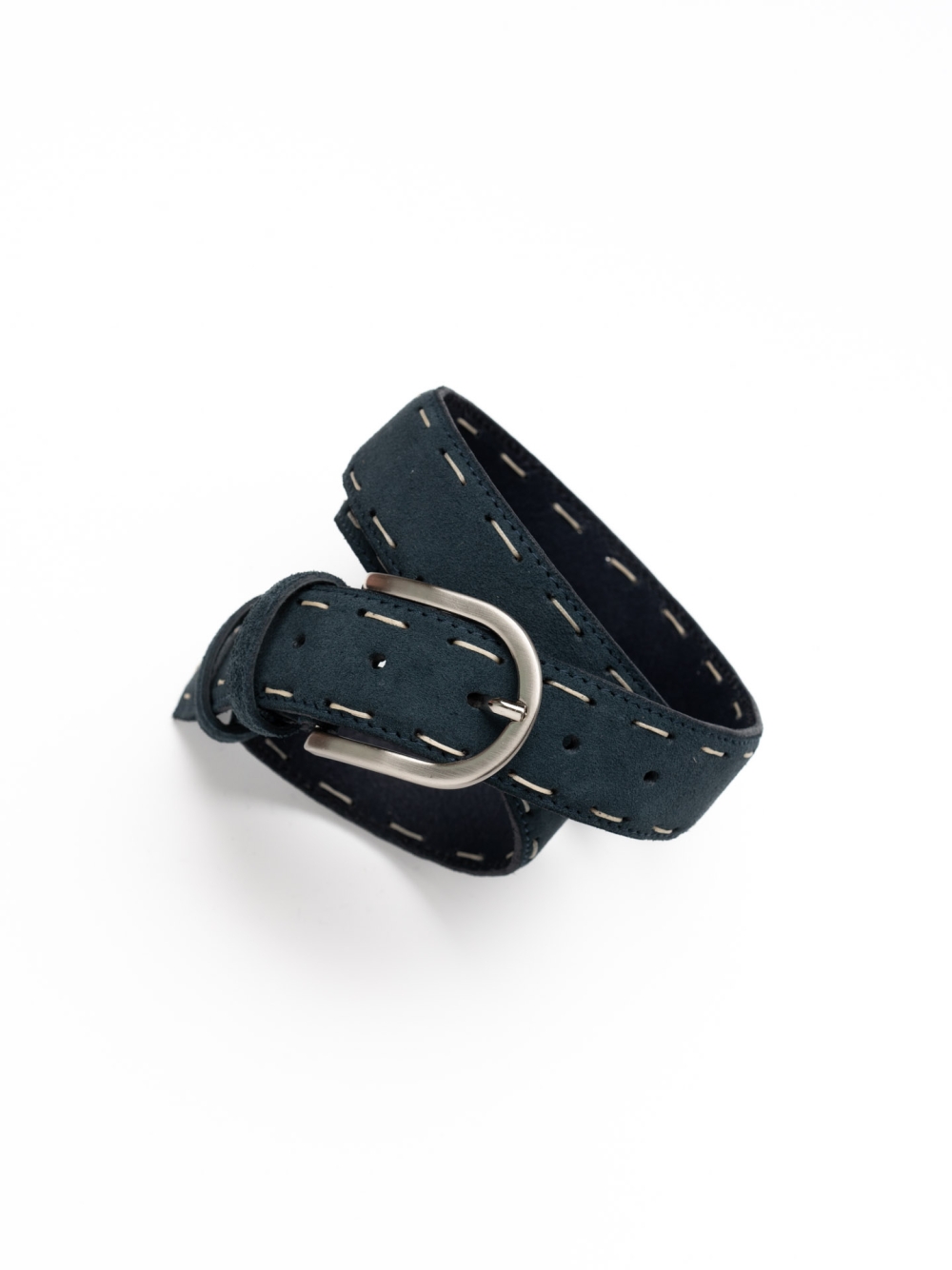 Cintura uomo in morbido camoscio con cuciture a punto lungo in contrasto color sabbia e fibbia in nichel satinato.
