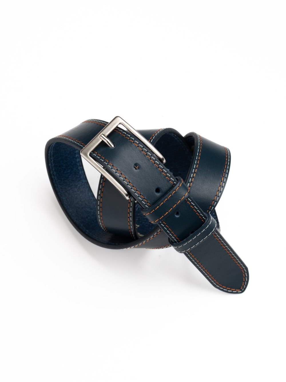 Realizzata in pelle di alta qualità, questa cintura si distingue per la doppia cucitura a contrasto sabbia e arancione, che aggiunge dinamismo al design. La fibbia in nichel satinato dona un aspetto moderno e pulito, rendendola adatta a look sia casual che più ricercati. Disponibile in due varianti colore: blu e grigio.