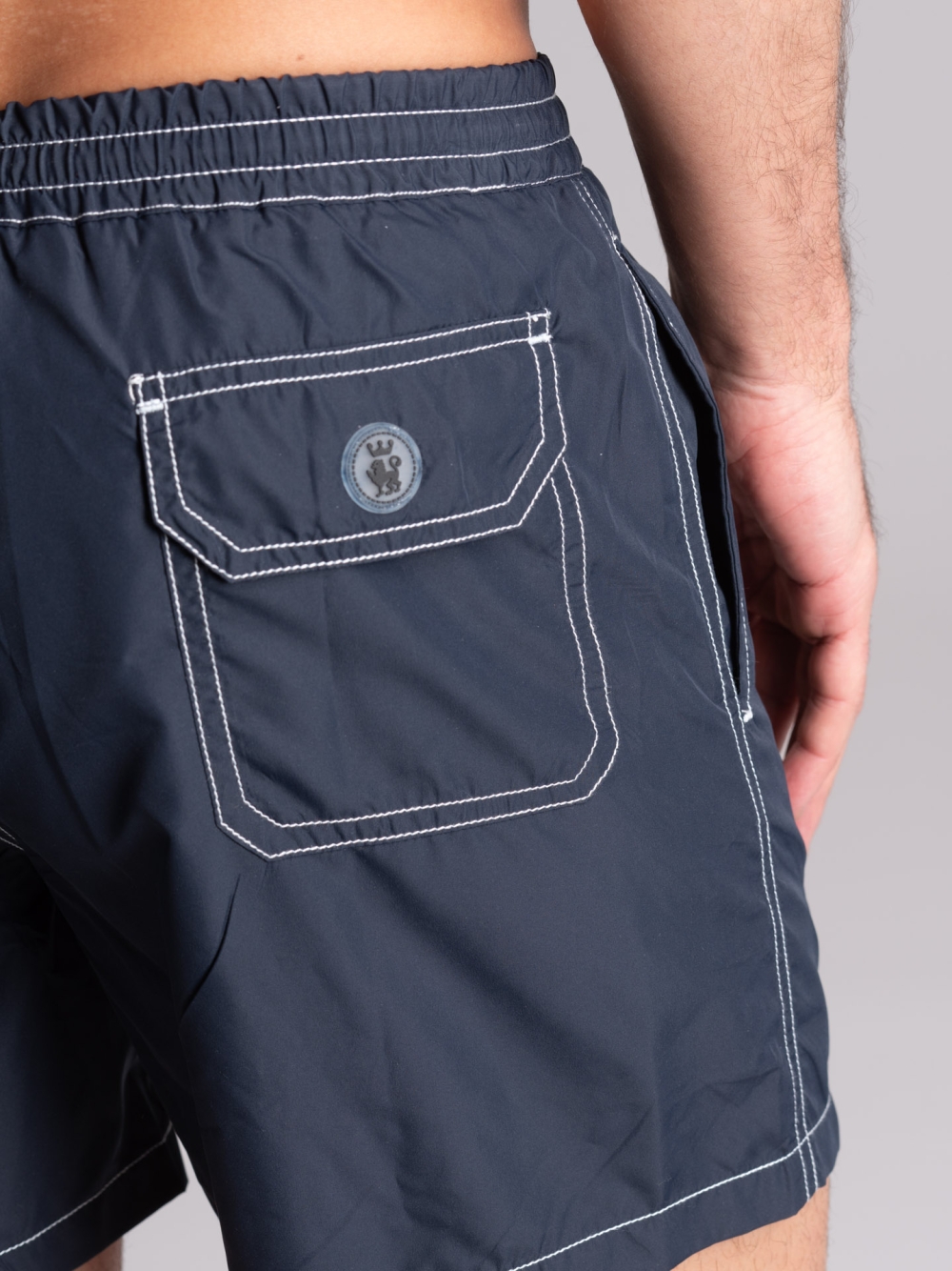 Costume da bagno da uomo modello pantaloncino realizzato in tessuto tecnico di nylon ad asciugatura rapida in tinta unita con cuciture a contrasto. Questo boxer da mare è caratterizzato da una coulisse in vita, tasche laterali e una tasca con pattina sul retro. È disponibile nelle varianti colore blu e verde militare chiaro, in abbinamento a molte t-shirt e polo della nuova collezione estate 2024. Questo articolo è accompagnato dal sacchettino porta costume realizzato nello stesso colore e tessuto.