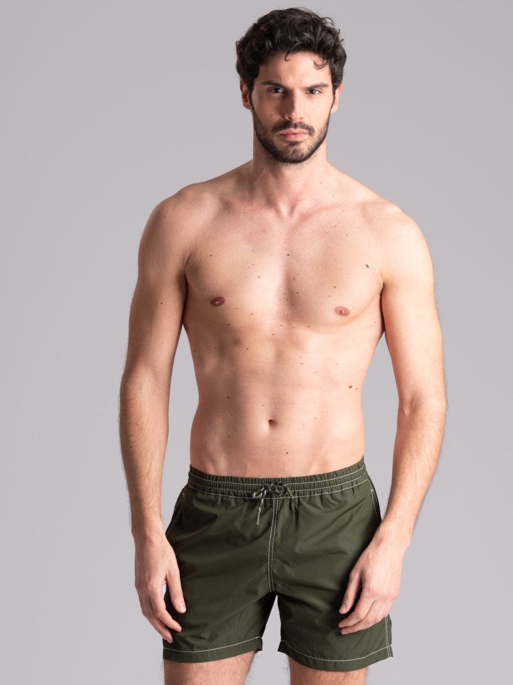 Costume da bagno da uomo modello pantaloncino realizzato in tessuto tecnico di nylon ad asciugatura rapida in tinta unita con cuciture a contrasto. Questo boxer da mare è caratterizzato da una coulisse in vita, tasche laterali e una tasca con pattina sul retro. È disponibile nelle varianti colore blu e verde militare chiaro, in abbinamento a molte t-shirt e polo della nuova collezione estate 2024. Questo articolo è accompagnato dal sacchettino porta costume realizzato nello stesso colore e tessuto.