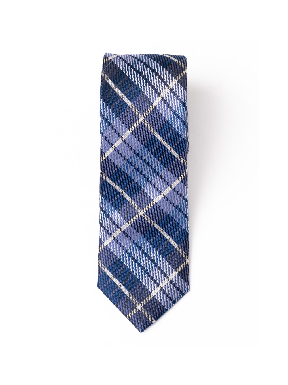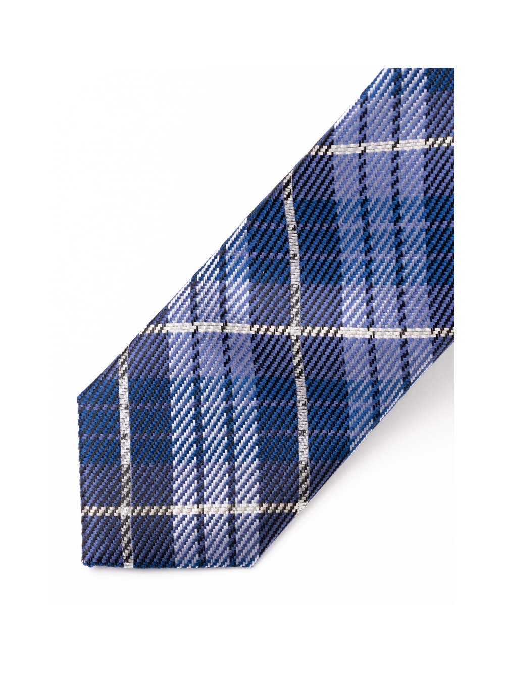 Cravatta uomo in seta con elegante fantasia Tartan, disponibile nelle varianti colore blu-blu chiaro e blu-verde.