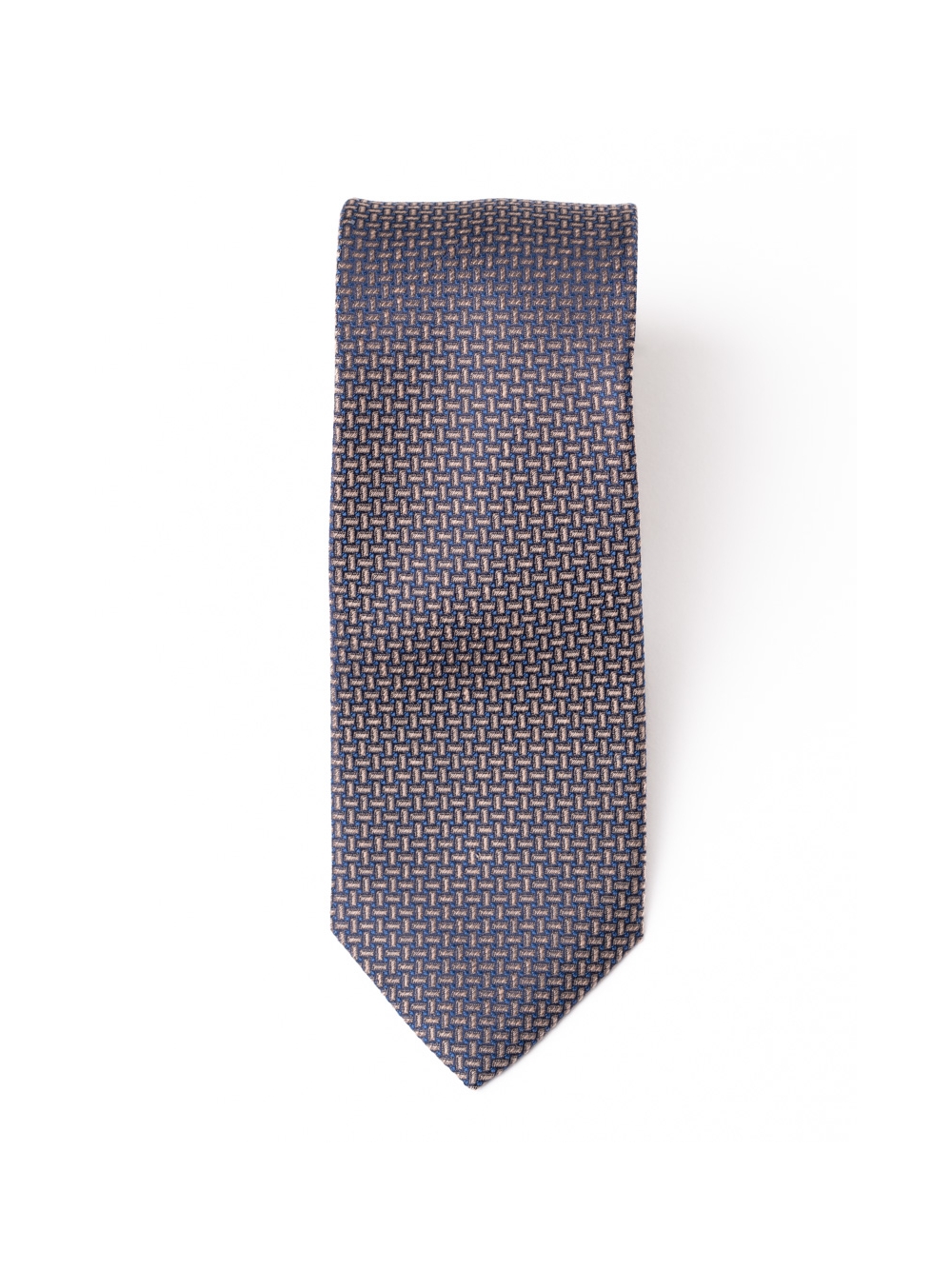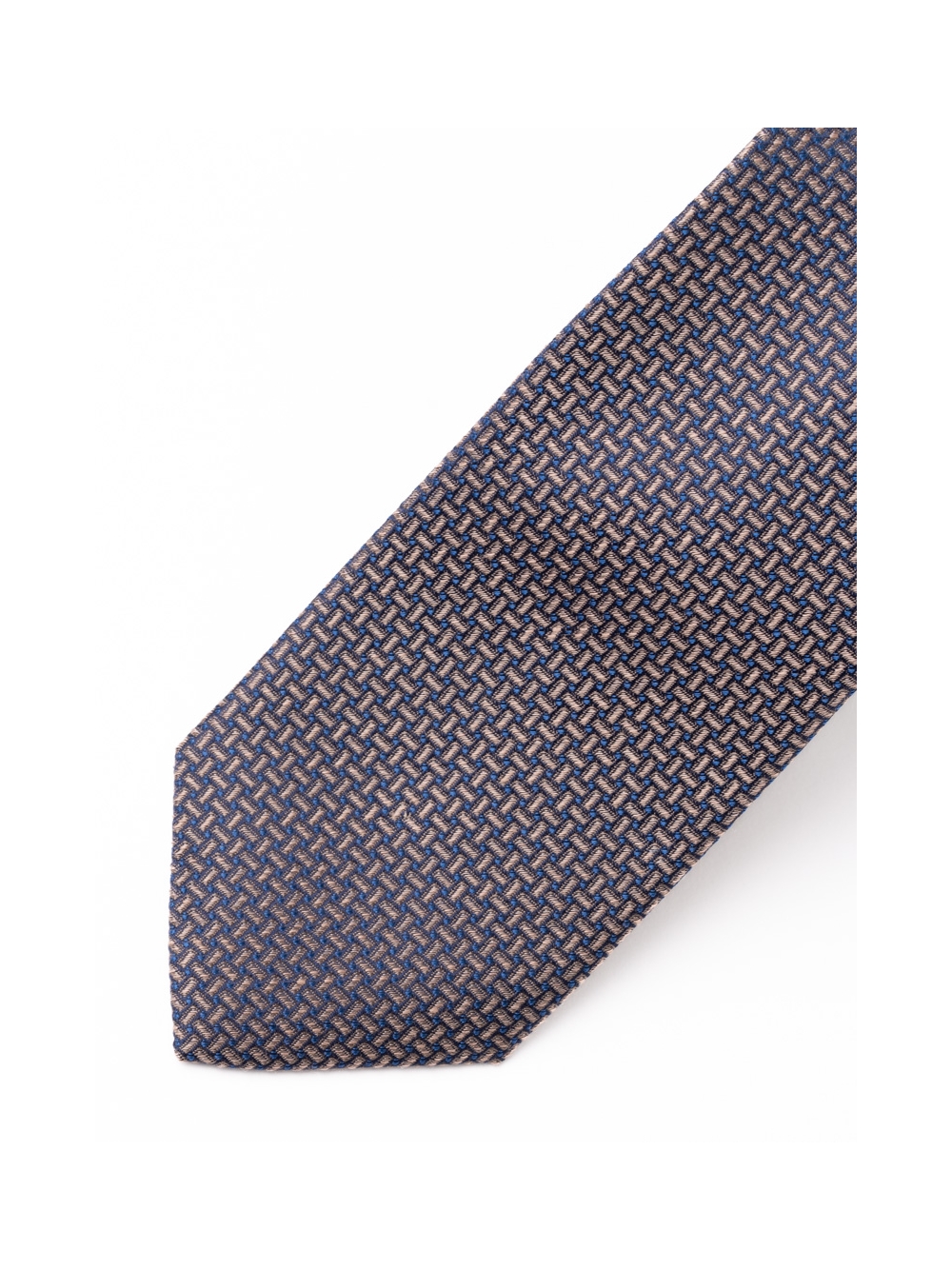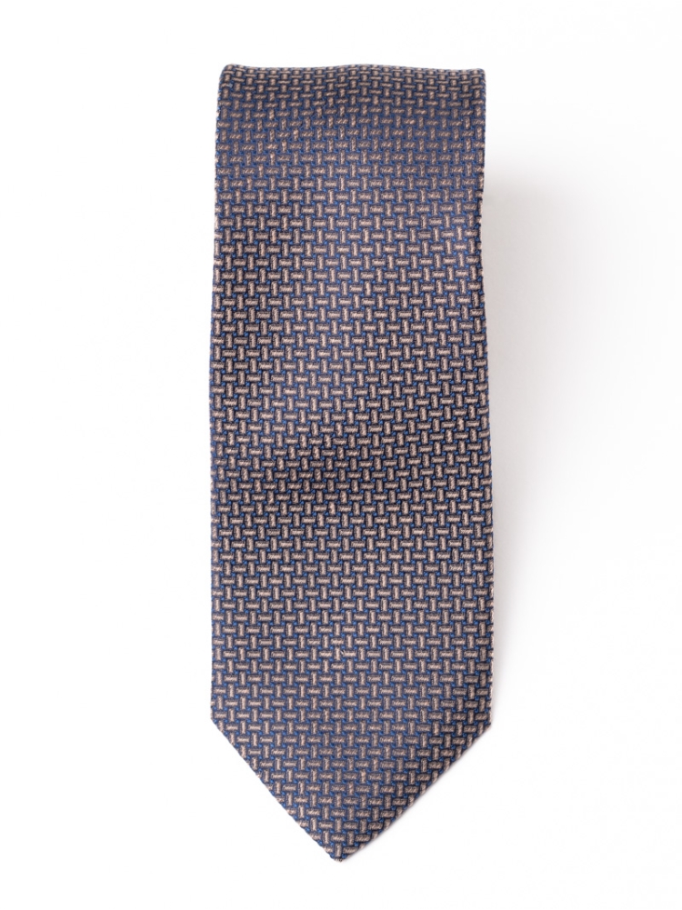 Cravatta uomo in seta e lino caratterizzata da un micro disegno intrecciato, disponibile nelle varianti colore blu chiaro-sabbia, blu-grigio e blu-tabacco.