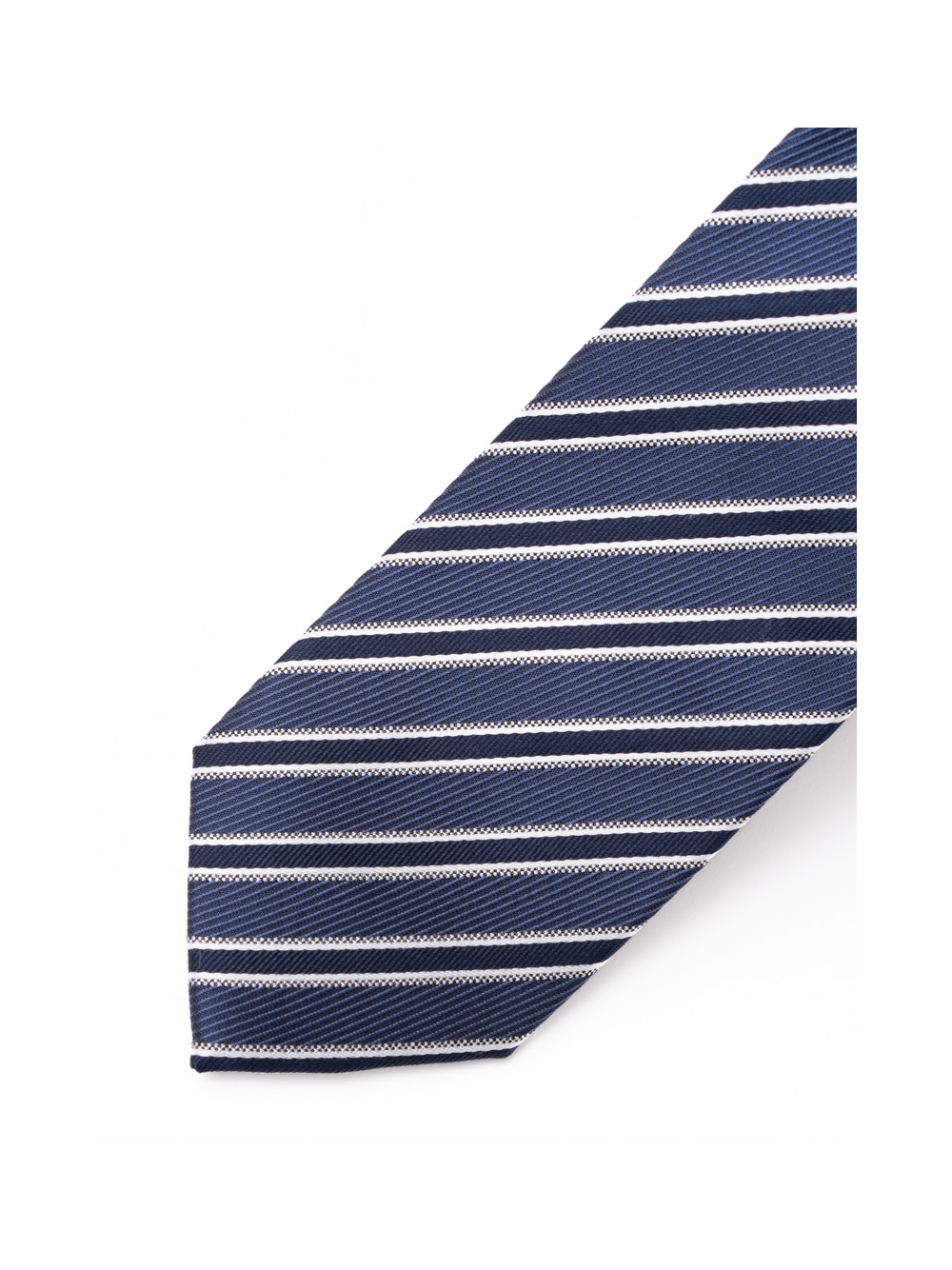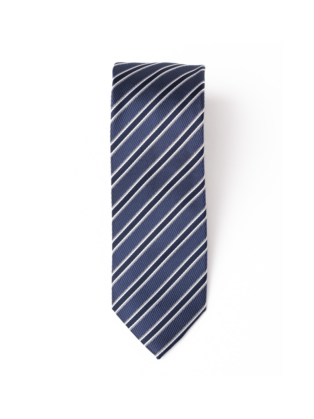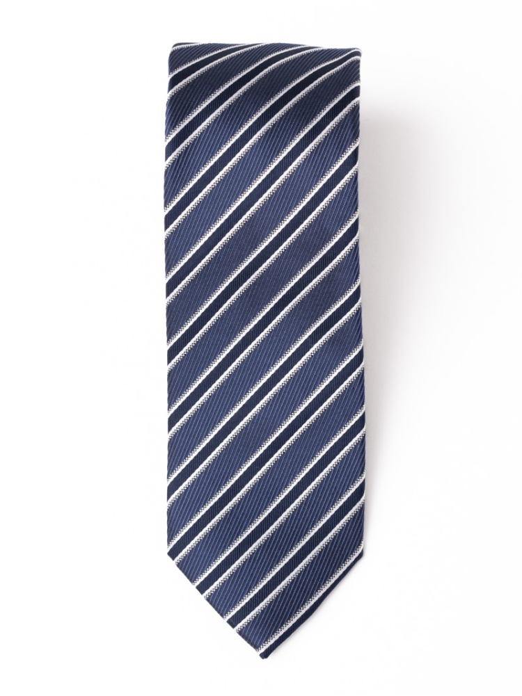 Cravatta uomo in seta caratterizzata da una classica fantasia Regimental a riga stretta, disponibile nelle varianti colore blu-grigio e bordeaux-grigio.