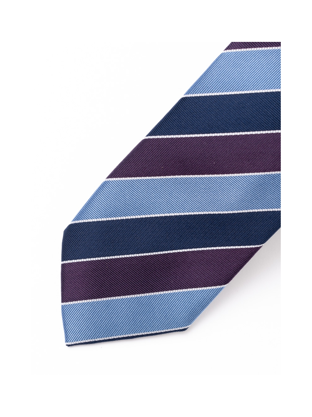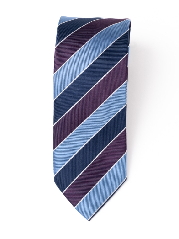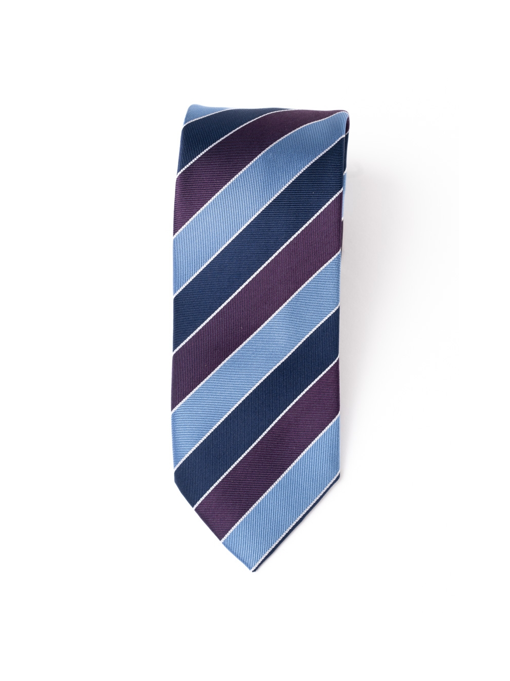 Cravatta uomo in seta caratterizzata da una classica fantasia Regimental a riga larga, disponibile nelle varianti colore blu-avio-verde, blu-tabacco-senape e blu-avio-bordeaux.