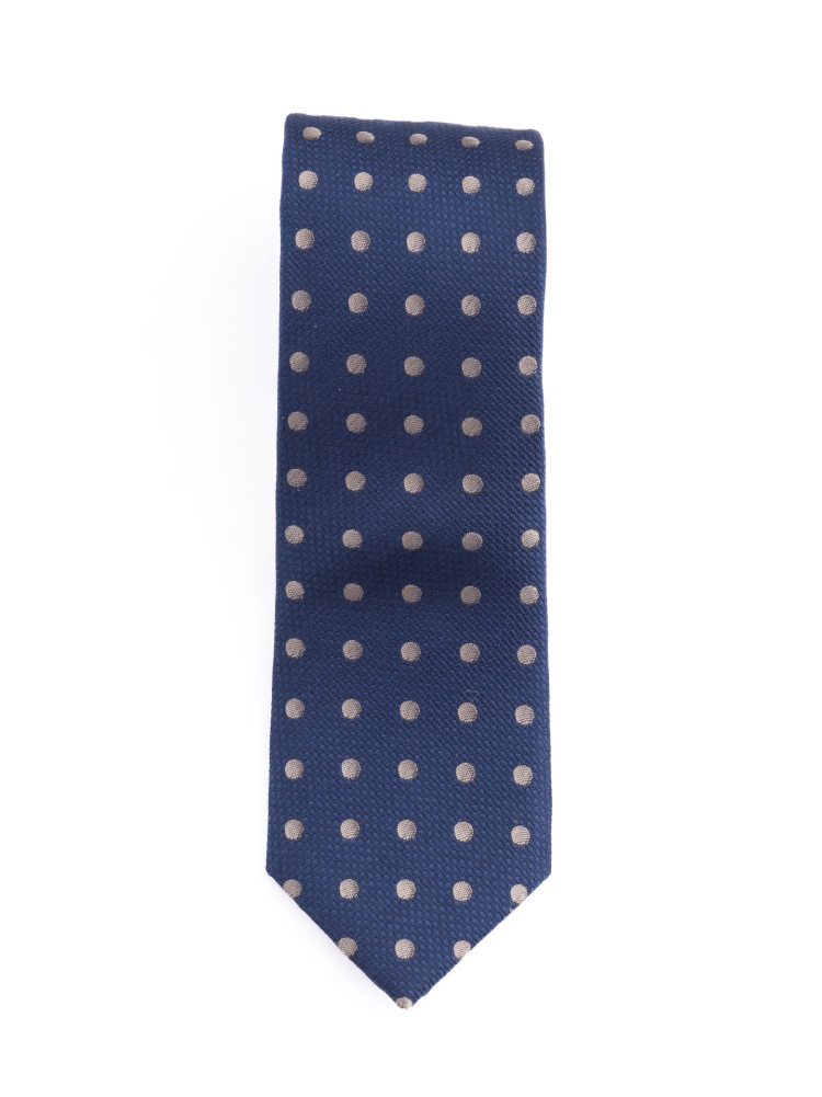 Cravatta uomo in seta armaturata con fantasia a pois color sabbia su base blu.