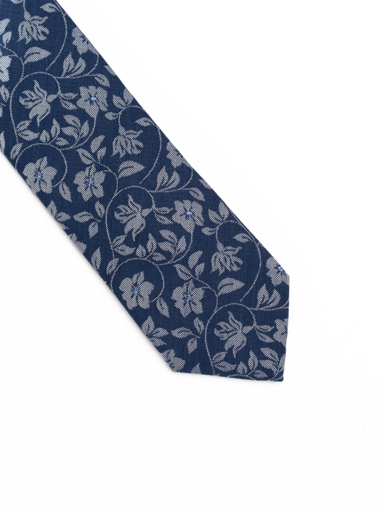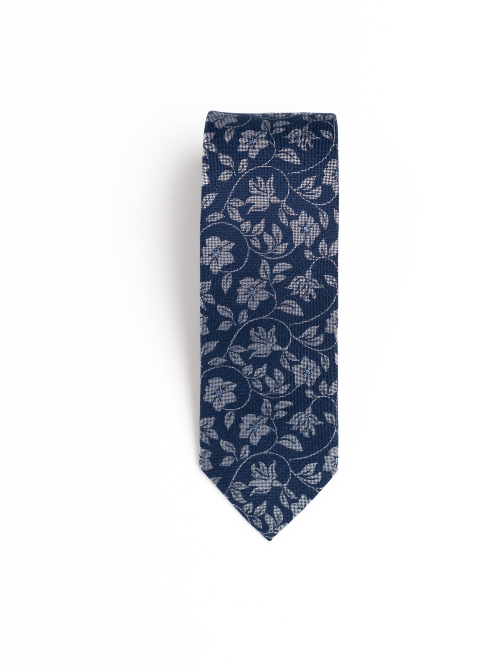 Cravatta in pura seta con delicato motivo floreale, disponibile nelle varianti blu/avio e beige.
