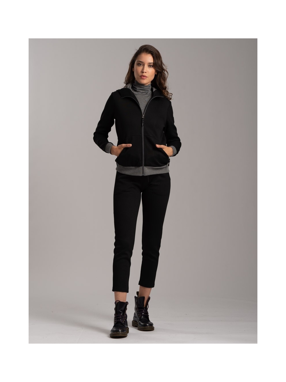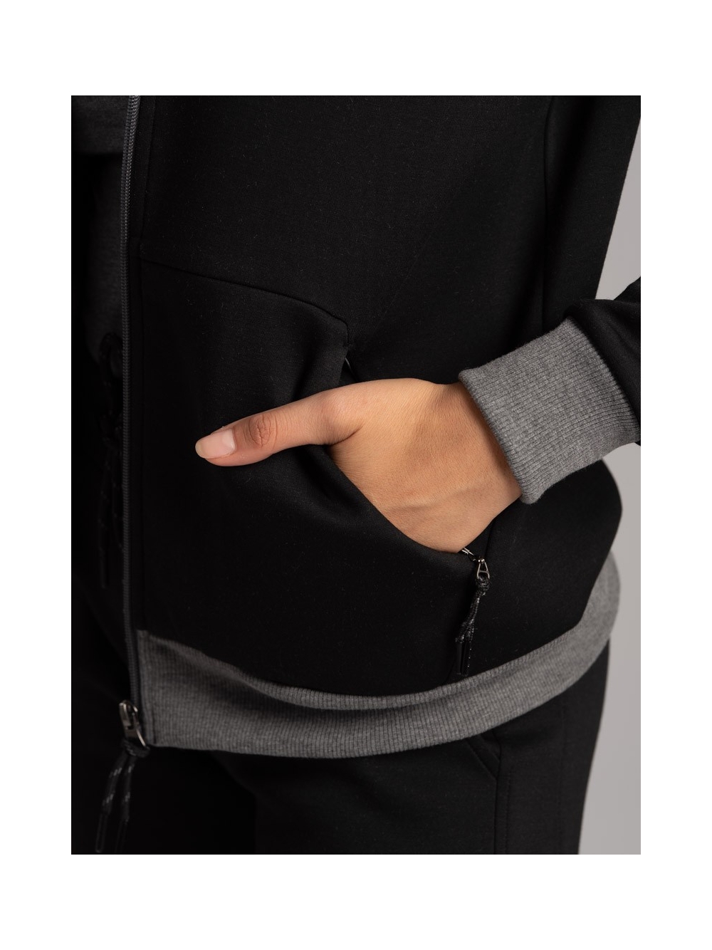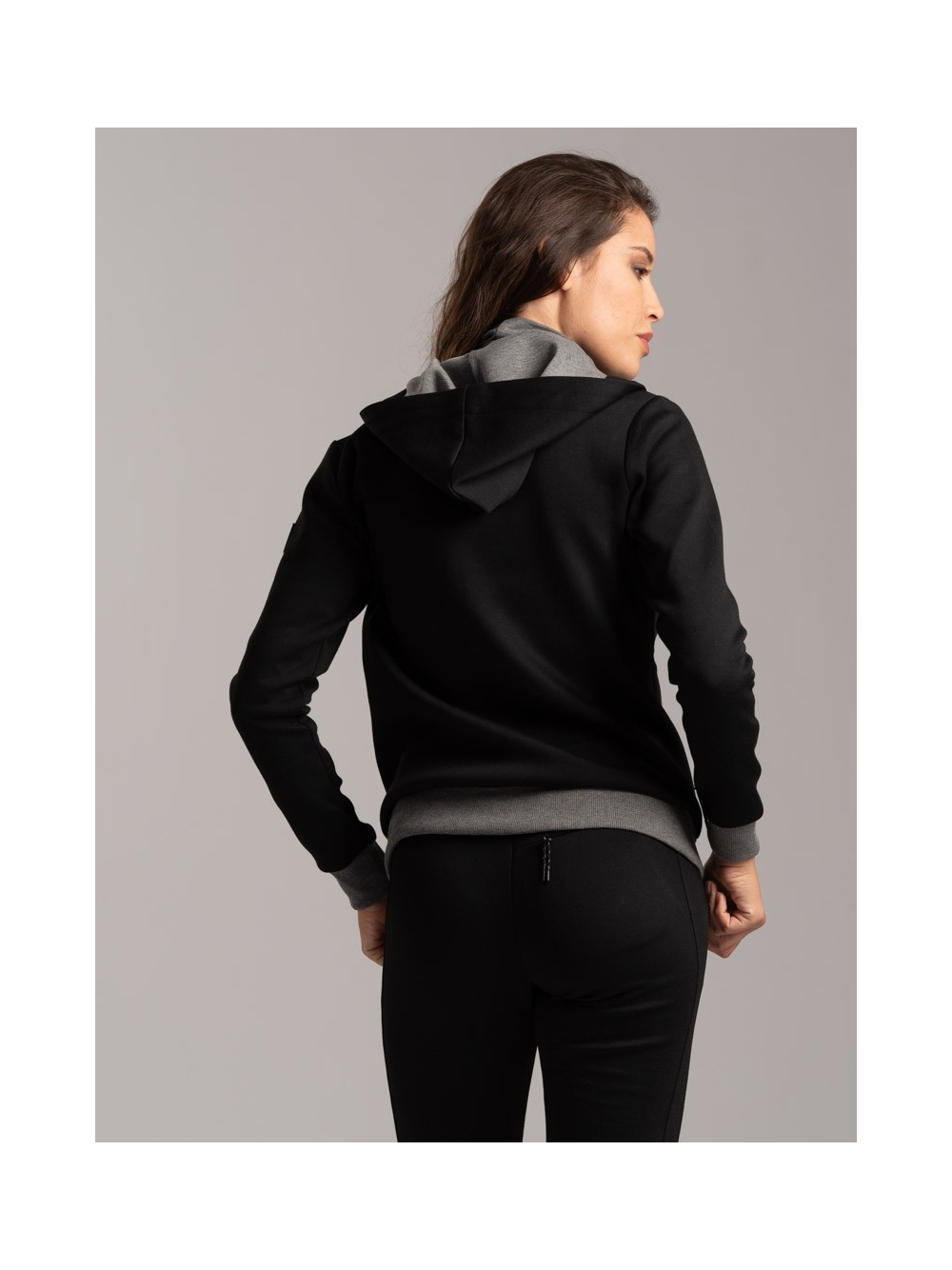 Felpa donna con cappuccio realizzato in tessuto tecnico (Scuba) bicolore, con zip invisibili, nascoste nei tagli ergonomici del capo.