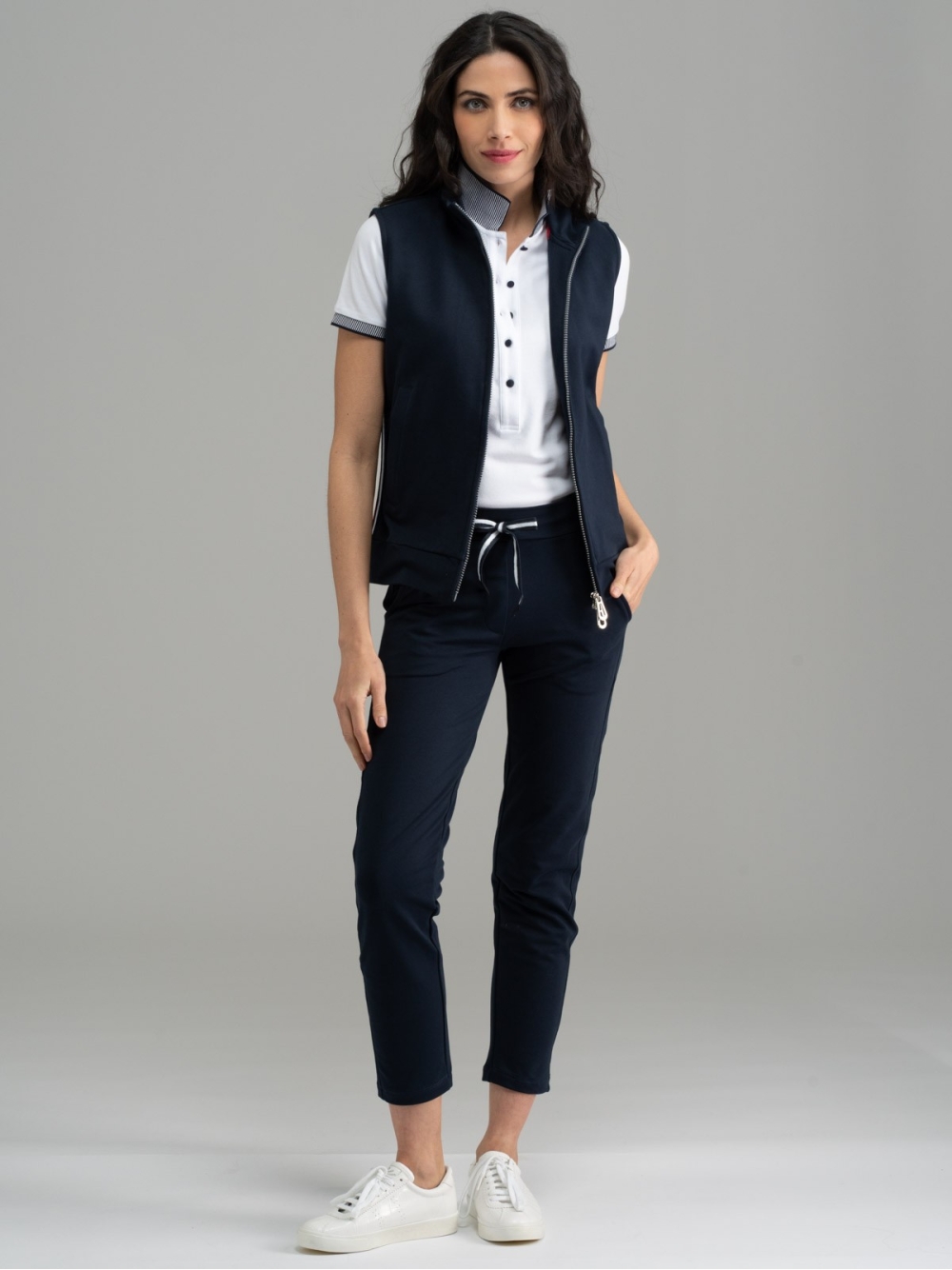 Gilet donna in Jersey blu con banda bianca