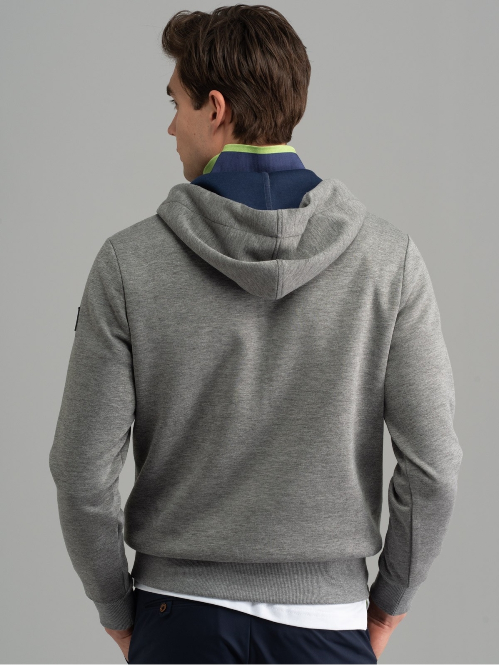 Felpa uomo in tessuto Scuba con cuciture sui fianchi e una tasca a marsupio con zip invisibili. Il cappuccio presenta una coulisse con nastrino blu.