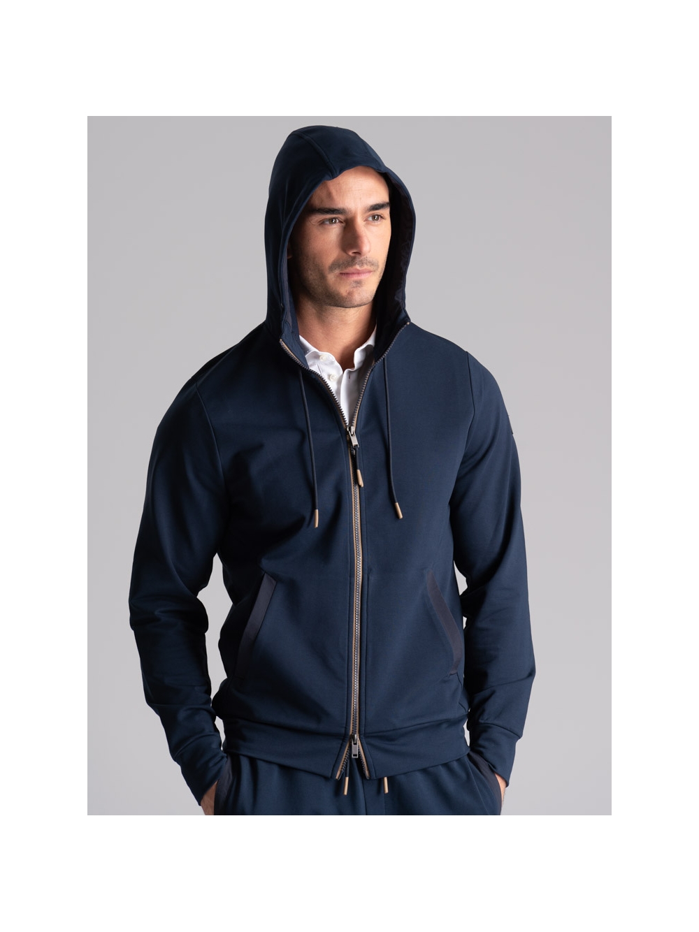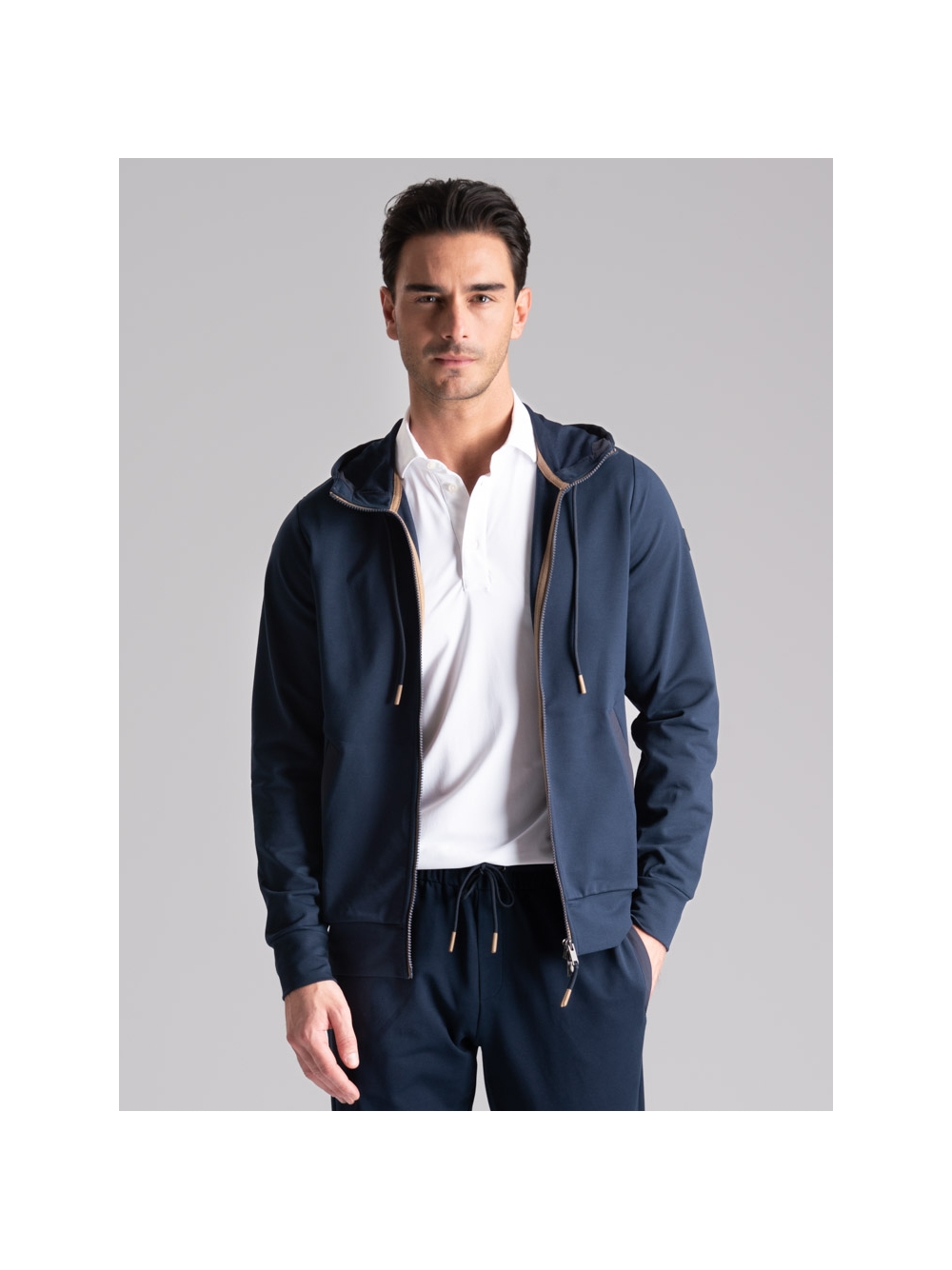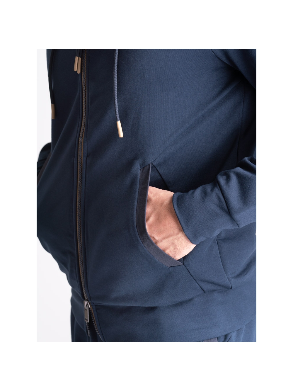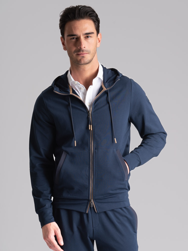 Felpa uomo full zip con cappuccio realizzata in tessuto TECNO molto performante: confortevole, elastico, traspirante, no pieghe e no stiro. La felpa, disponibile nelle varianti colore blu e verde, presenta le zip di colore a contrasto sulla chiusura, tasche da taglio ergonomico con rib a contrasto ripreso anche nel pantalone jogger abbinato. Il cappuccio fisso presenta la coulisse regolabile, fermata da passanti sul collo per direzionarla.
