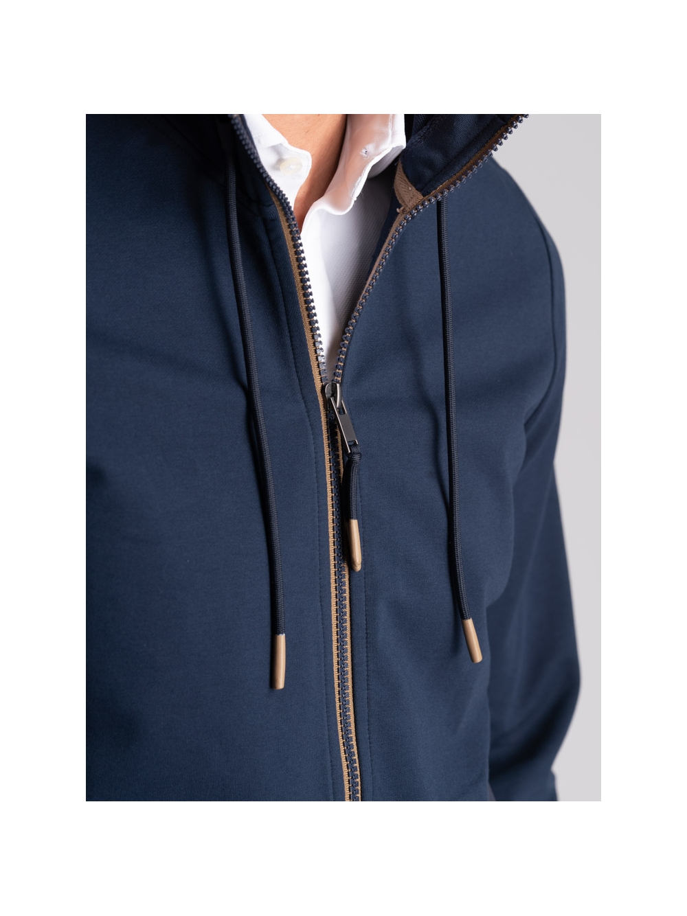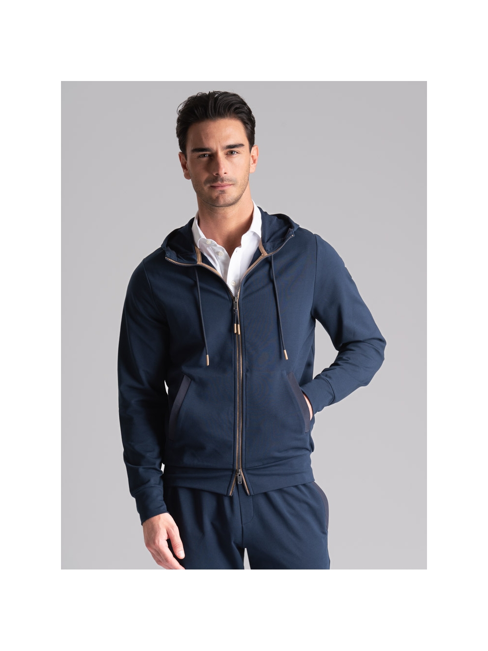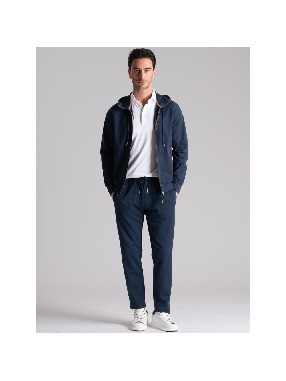 Felpa uomo full zip con cappuccio realizzata in tessuto TECNO molto performante: confortevole, elastico, traspirante, no pieghe e no stiro. La felpa, disponibile nelle varianti colore blu e verde, presenta le zip di colore a contrasto sulla chiusura, tasche da taglio ergonomico con rib a contrasto ripreso anche nel pantalone jogger abbinato. Il cappuccio fisso presenta la coulisse regolabile, fermata da passanti sul collo per direzionarla.