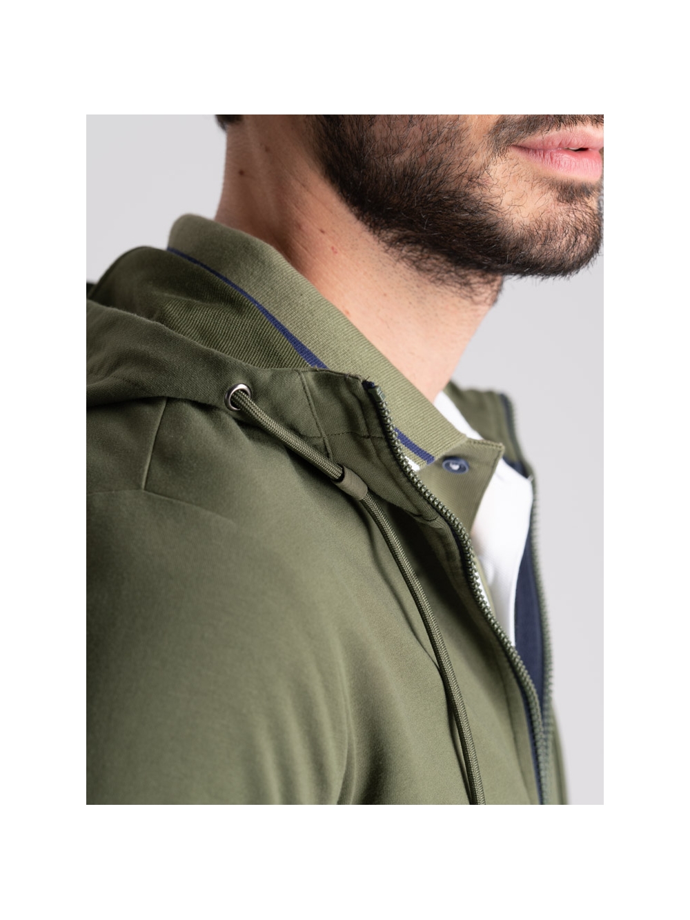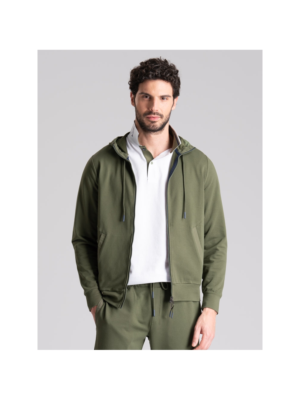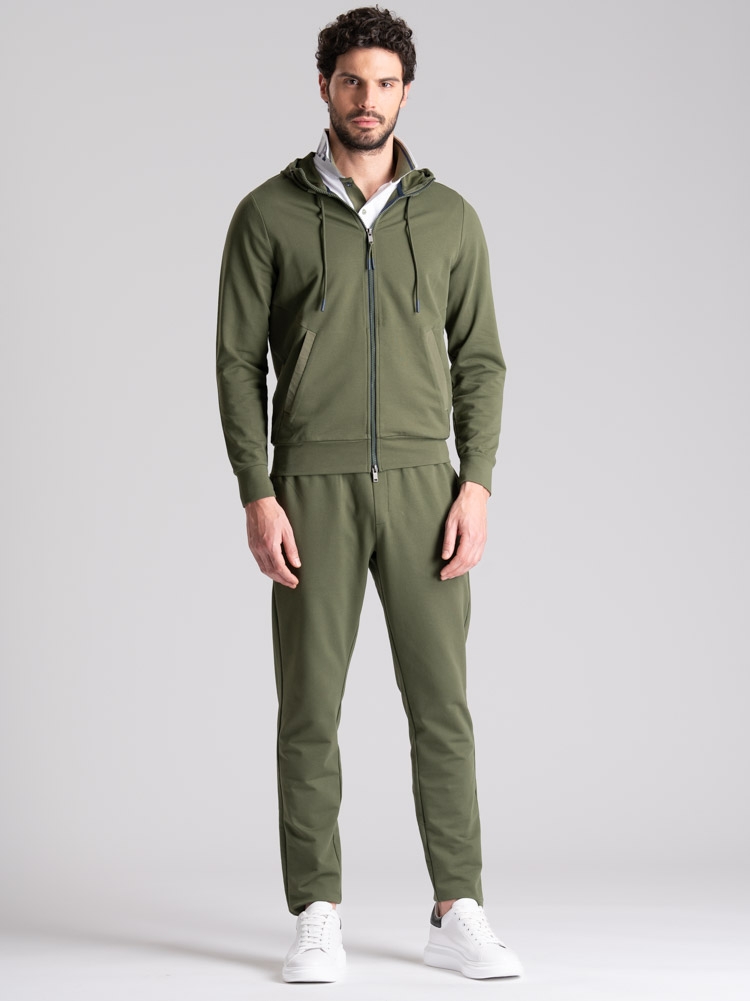 Felpa uomo full zip con cappuccio realizzata in tessuto TECNO molto performante: confortevole, elastico, traspirante, no pieghe e no stiro. La felpa, disponibile nelle varianti colore blu e verde, presenta le zip di colore a contrasto sulla chiusura, tasche da taglio ergonomico con rib a contrasto ripreso anche nel pantalone jogger abbinato. Il cappuccio fisso presenta la coulisse regolabile, fermata da passanti sul collo per direzionarla.