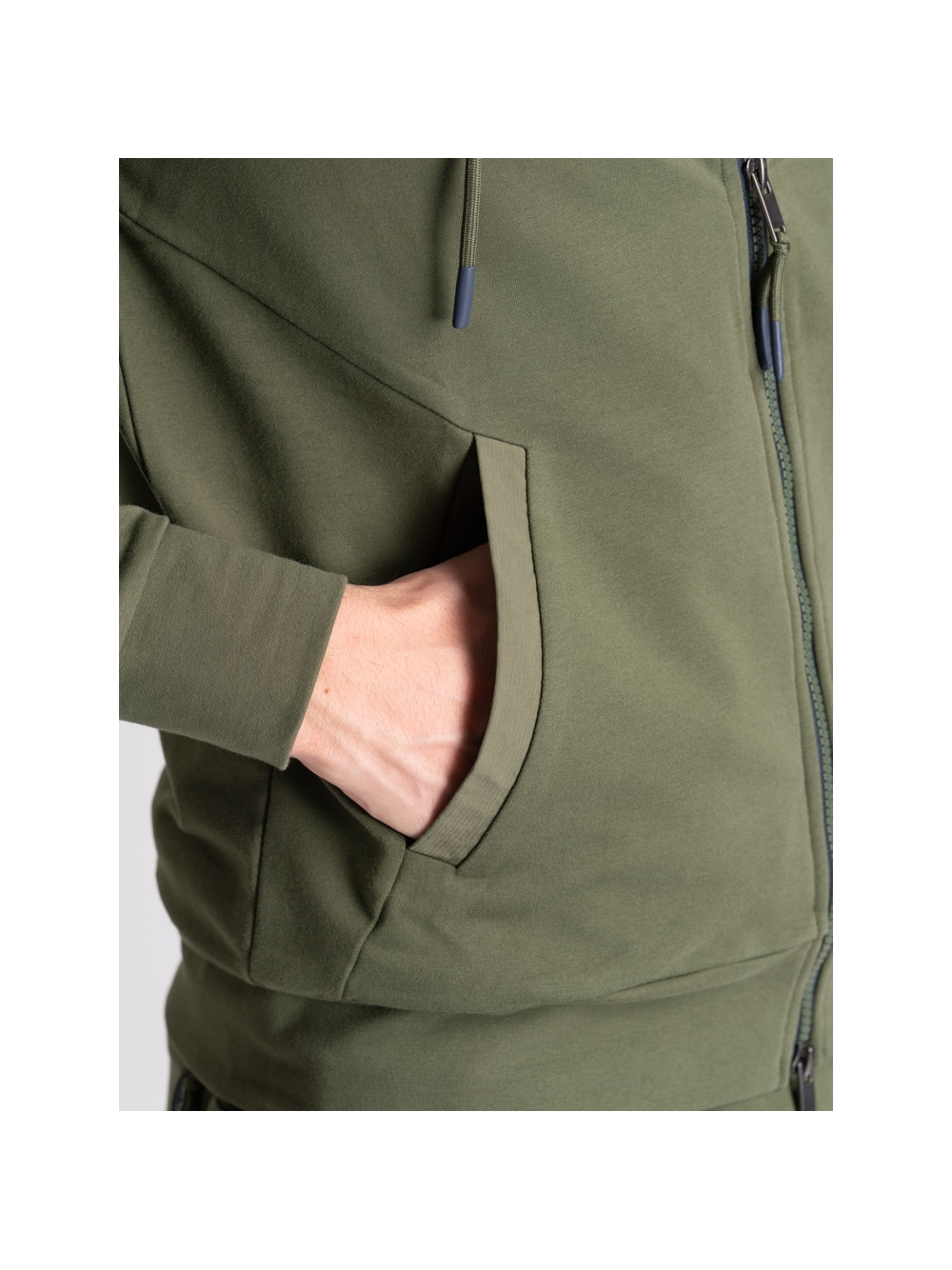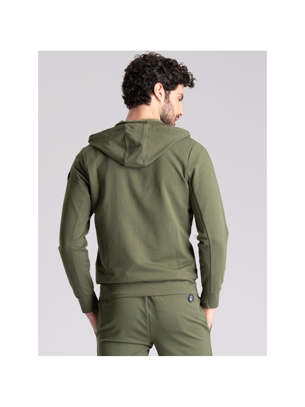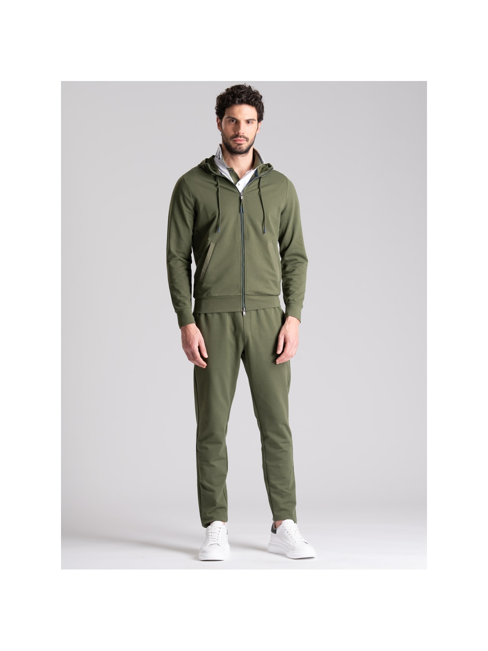 Felpa uomo full zip con cappuccio realizzata in tessuto TECNO molto performante: confortevole, elastico, traspirante, no pieghe e no stiro. La felpa, disponibile nelle varianti colore blu e verde, presenta le zip di colore a contrasto sulla chiusura, tasche da taglio ergonomico con rib a contrasto ripreso anche nel pantalone jogger abbinato. Il cappuccio fisso presenta la coulisse regolabile, fermata da passanti sul collo per direzionarla.