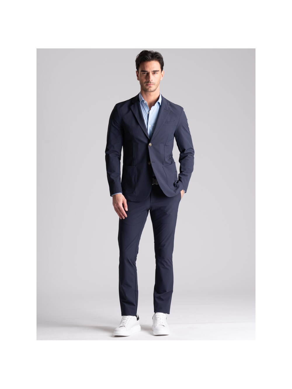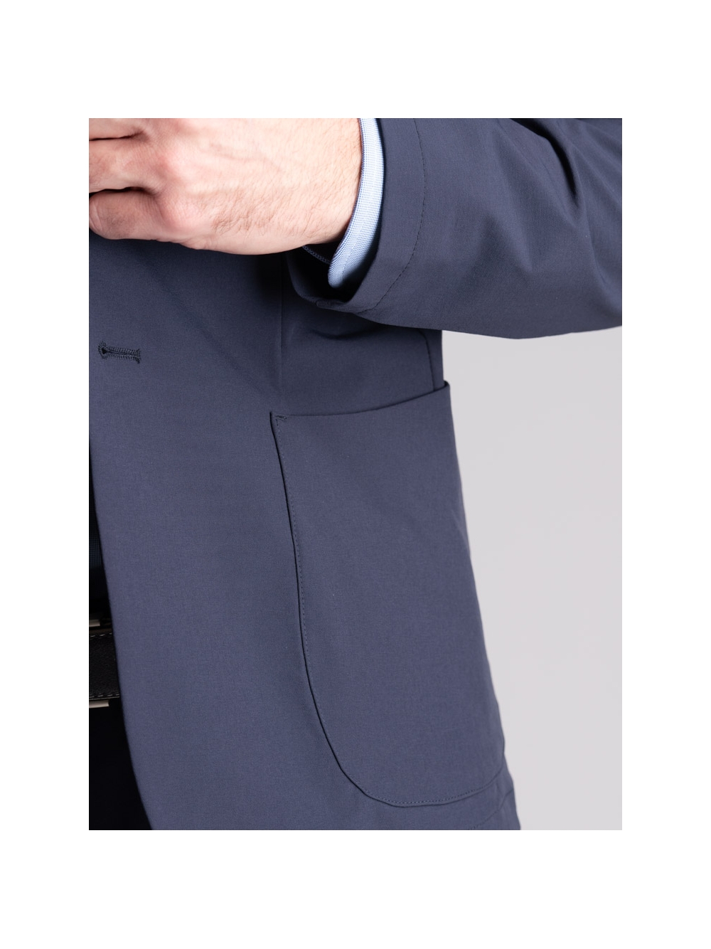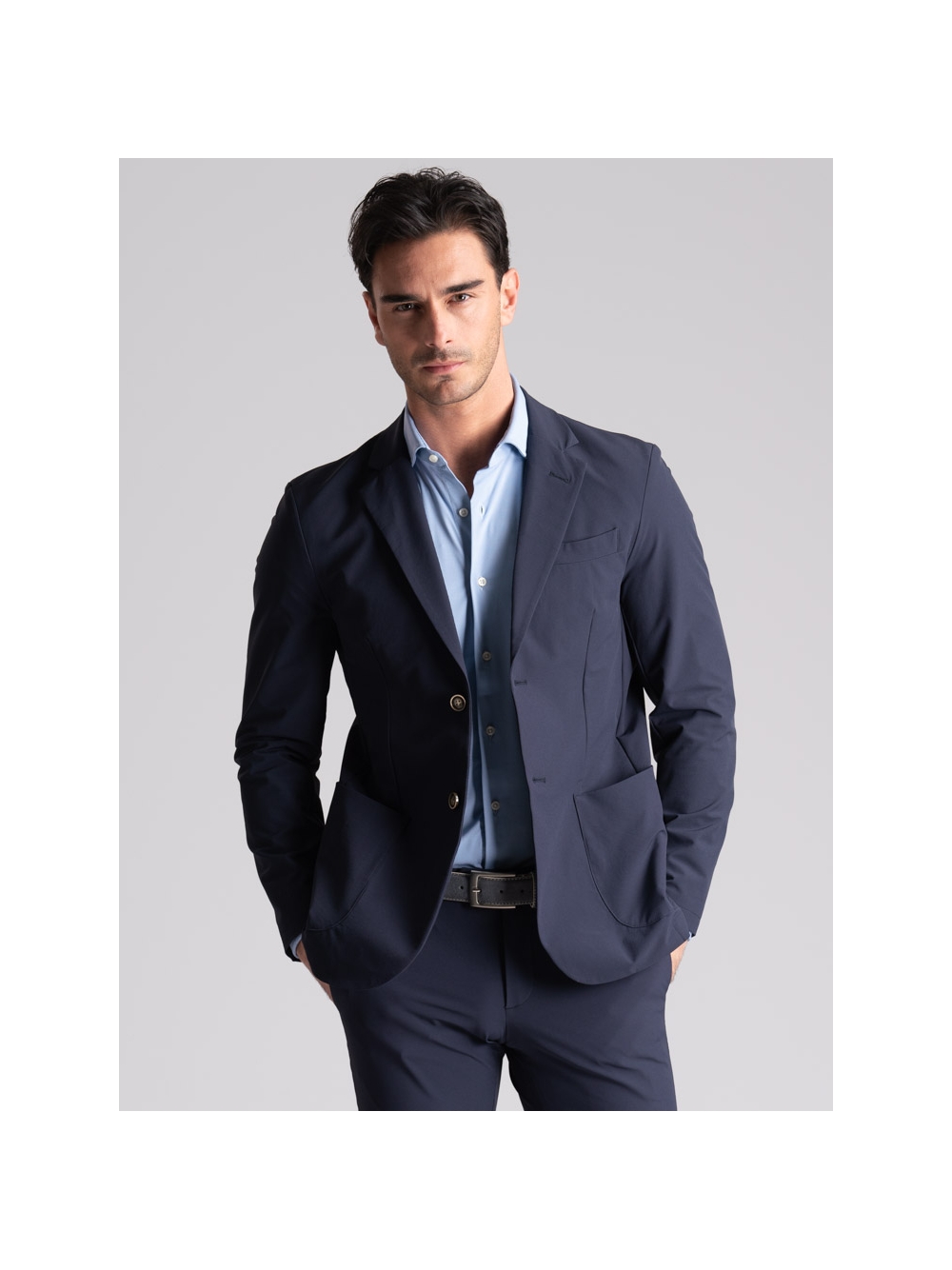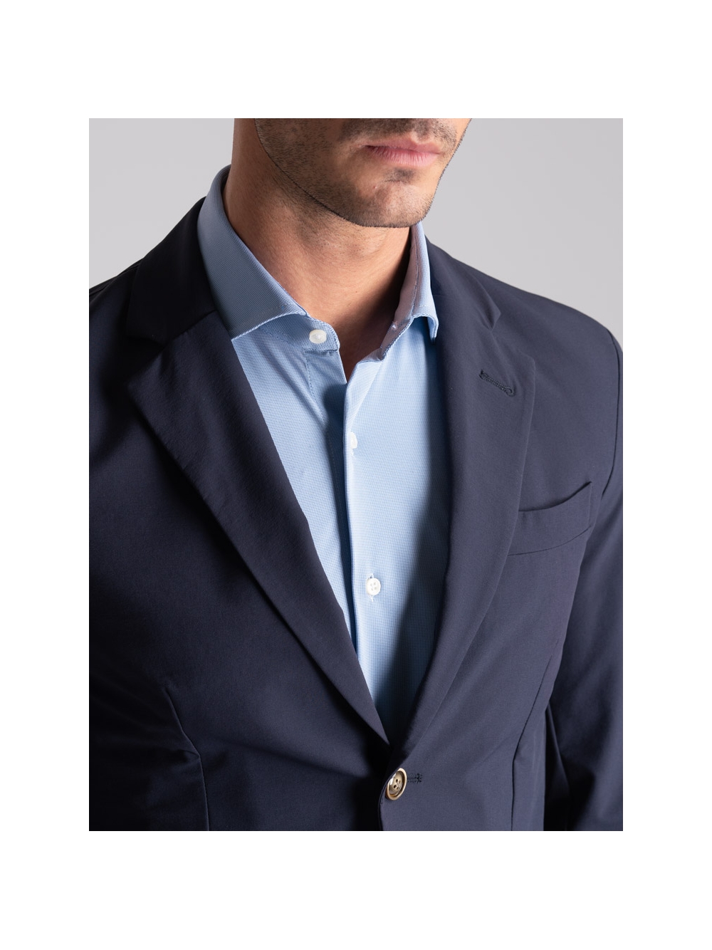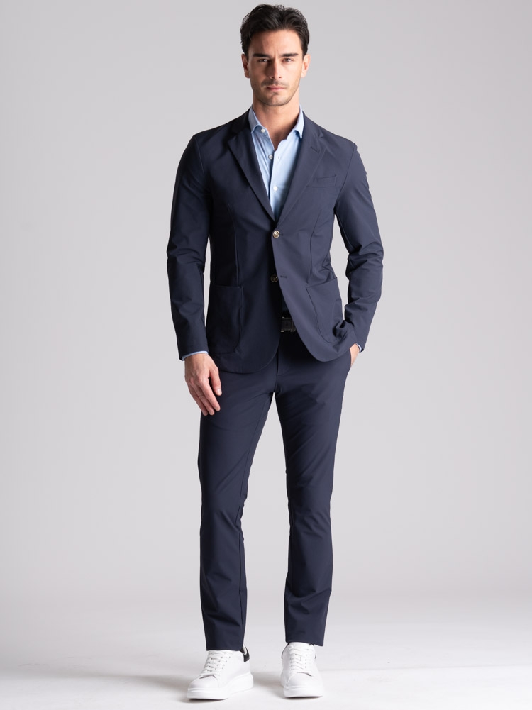 Giacca uomo sfoderata in tessuto TECNO stretch effetto crêpe dalla vestibilità perfetta e confortevole.
