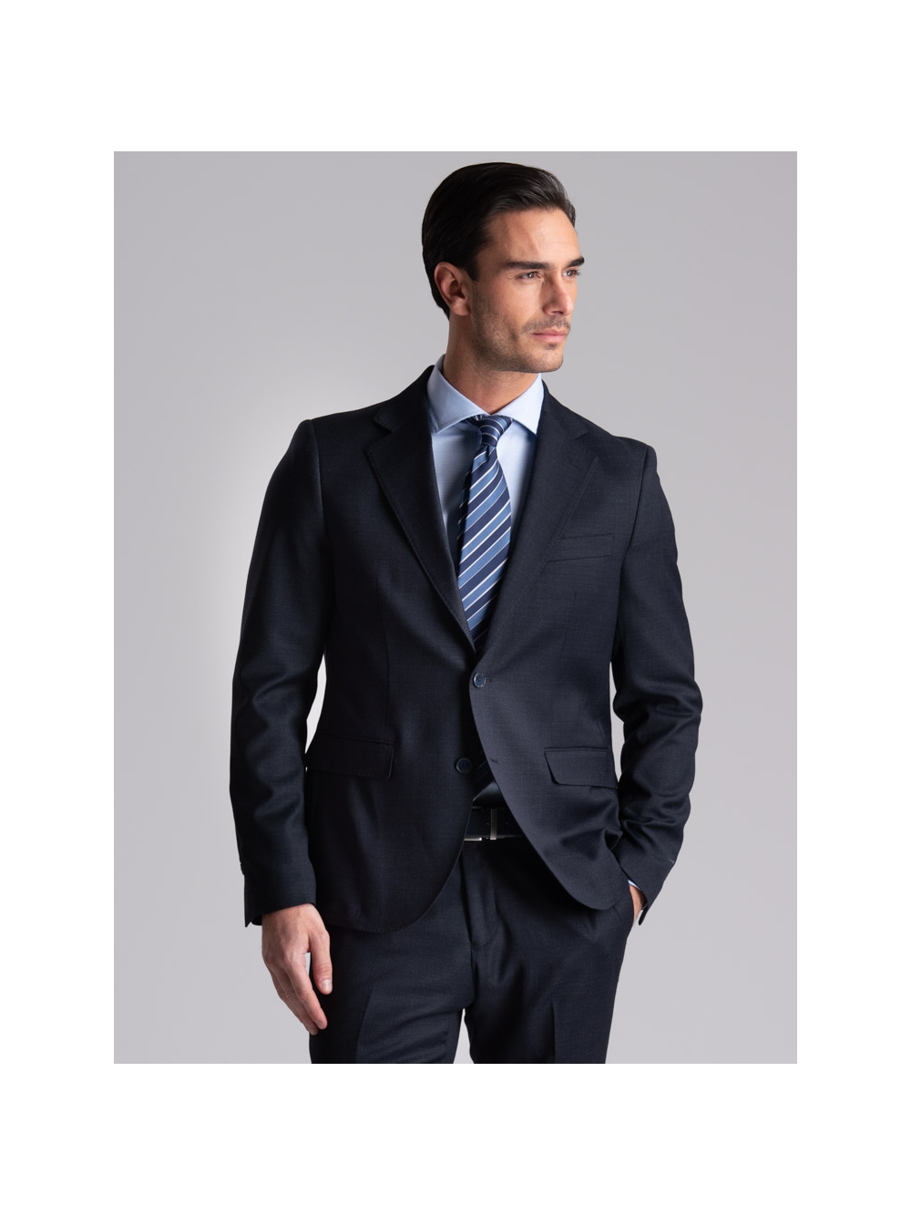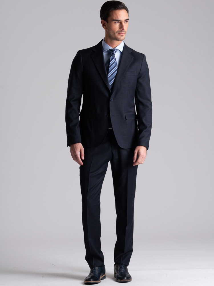 Giacca due bottoni con revers classici e pantalone, entrambi realizzati in tessuto leggero di lana per la primavera estate, con vestibilità slim.