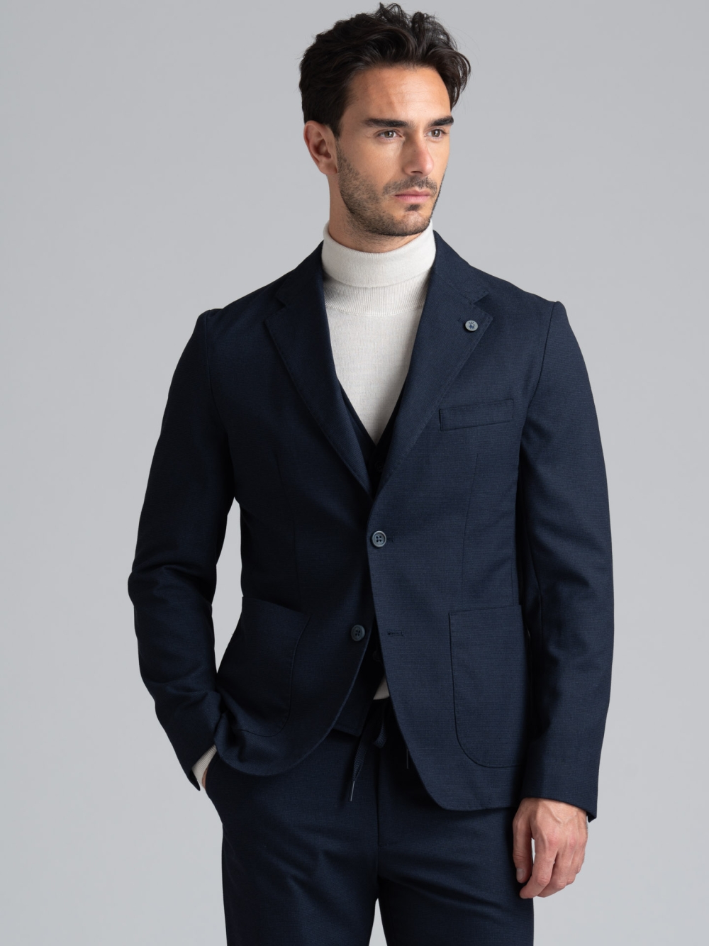 Giacca uomo con fantasia micro pied de poule blu, sfoderata, realizzata in tessuto a mano calda abbinato al gilet e al pantalone.