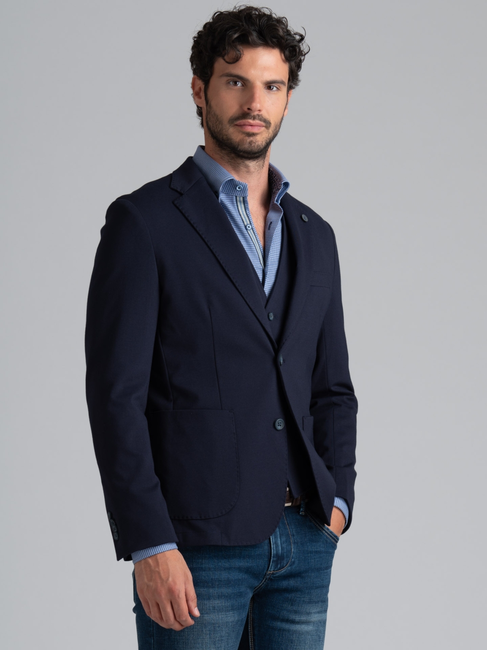 Giacca uomo in Jersey di cotone stretch, confortevole da indossare e adatta a tutte le fisicità, disponibile nel colore blu e verde.