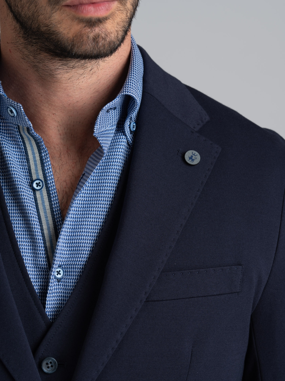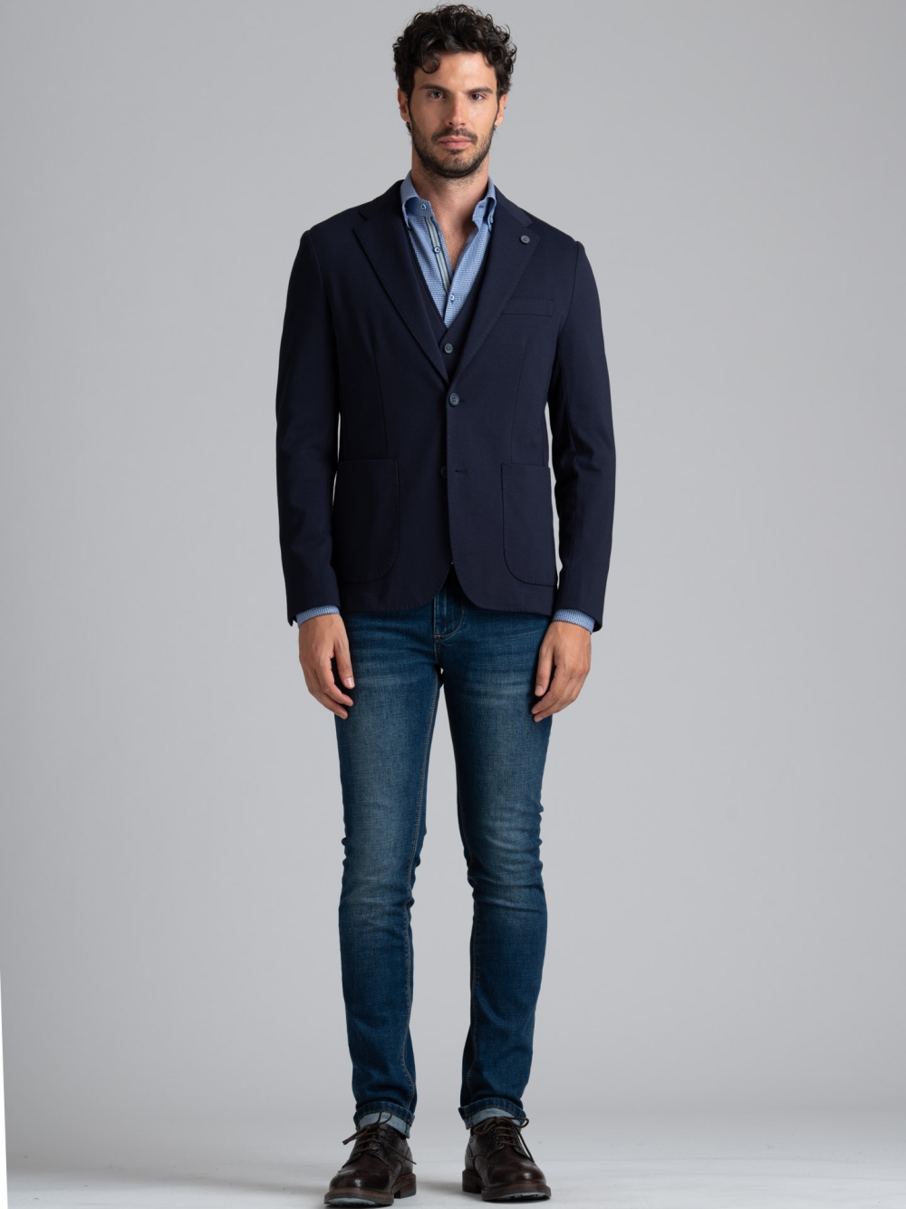 Giacca uomo sfoderata realizzata in tessuto di cotone Jersey Punto Milano stretch, confortevole da indossare in tutte le stagioni e ideale per vestire ogni fisicità. La cucitura con punto AMF sul revers classico e le tasche è un richiamo allo stile sartoriale, che dona alla giacca un tocco di classe. Questo capo presenta una piccola spilletta con il logo INVIDIA 1973 sul revers e cuciture in pulito, è sfoderata con tasche di servizio costruite con la massima cura e rifinita perfettamente grazie alle bordature e altri dettagli. Questa giacca è disponibile nelle varianti colore blu e verde e presenta il gilet abbinato realizzato nello stesso tessuto e colore. L’abbinamento giacca e gilet è perfetto per una moda uomo ufficio se abbinato ad una camicia office, ma è ideale anche per chi vuole vestire un’eleganza giovanile in abbinamento a una t-shirt.