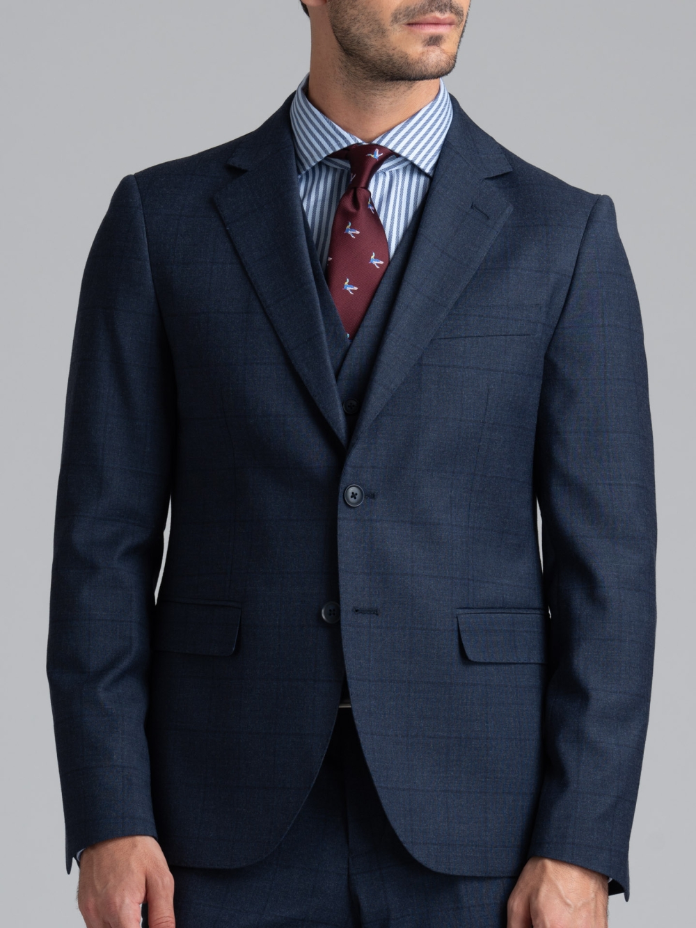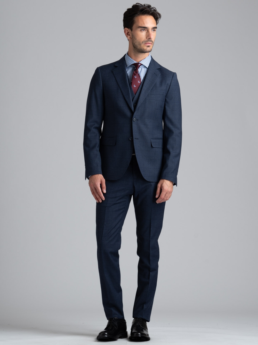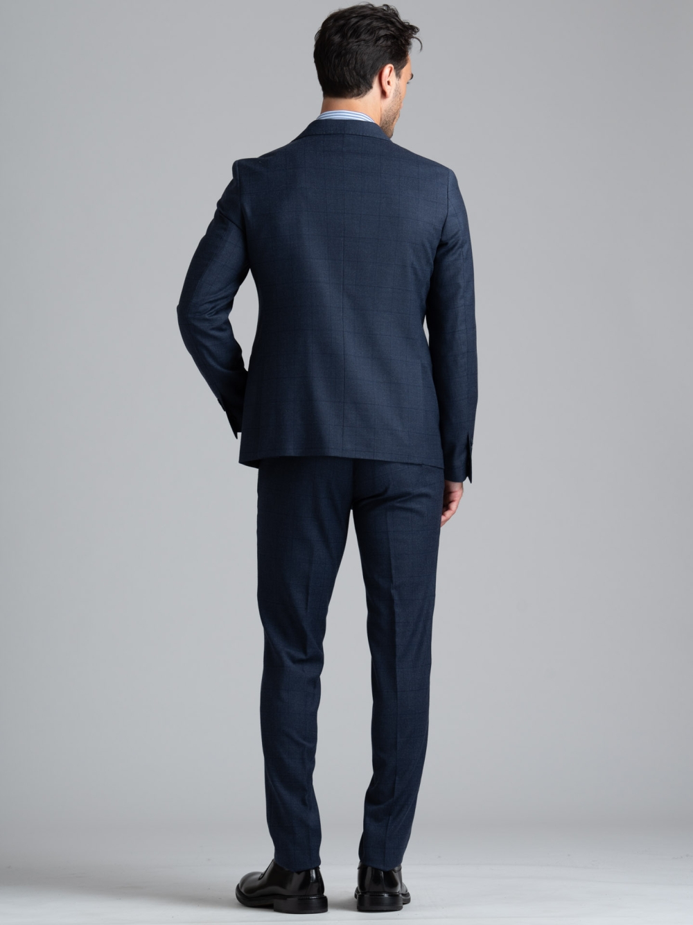 Giacca e pantalone, realizzati in tessuto misto lana, caratterizzati da un disegno madras leggero con effetto finestrato e rifiniture sartoriali.