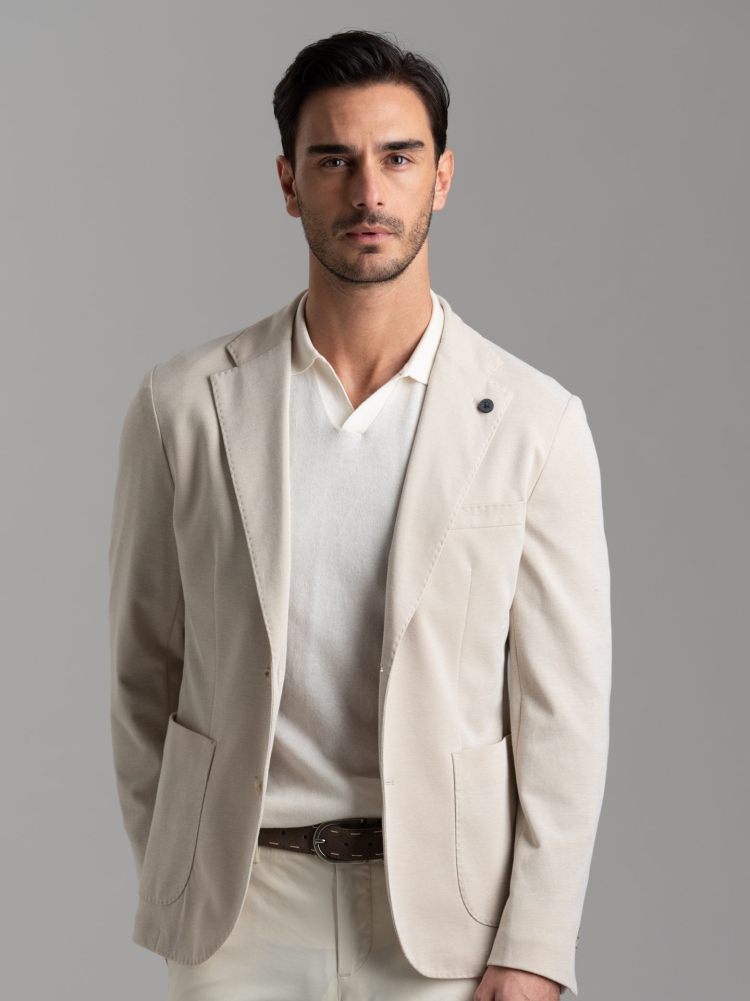 La giacca uomo in piquet di cotone tinto filo è perfetta per le giornate più calde grazie alla sua leggerezza e alla struttura sfoderata. Il tessuto traspirante e la linea pulita la rendono versatile, adatta sia a contesti informali che a occasioni più eleganti. Disponibile nelle varianti beige e blu.