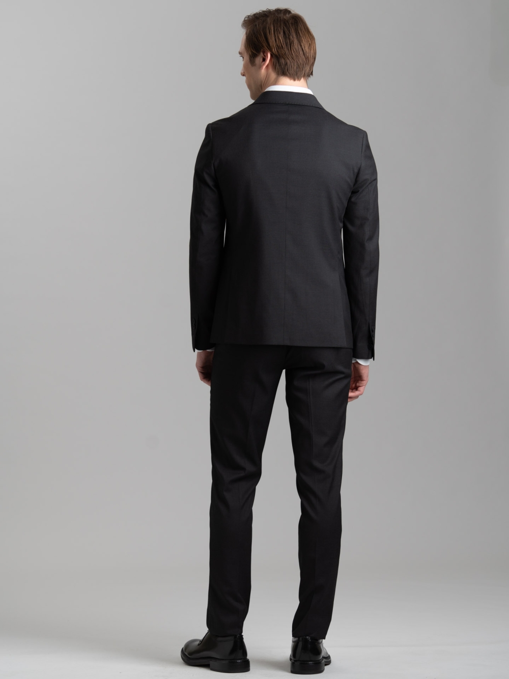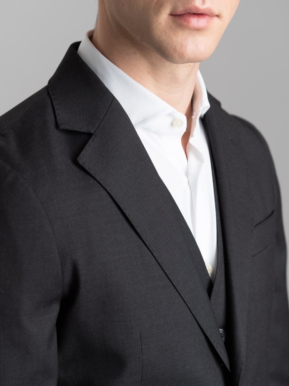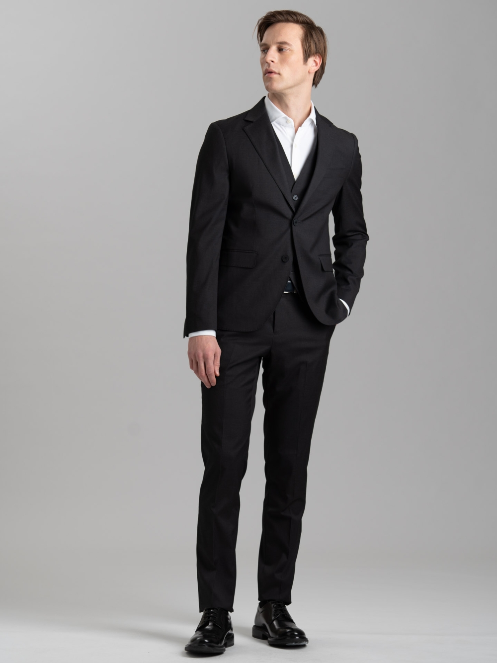 Giacca e pantalone realizzati in tessuto armaturato in poliviscosa nero con gilet abbinato, caratterizzati da una vestibilità confortevole e finiture sartoriali.
