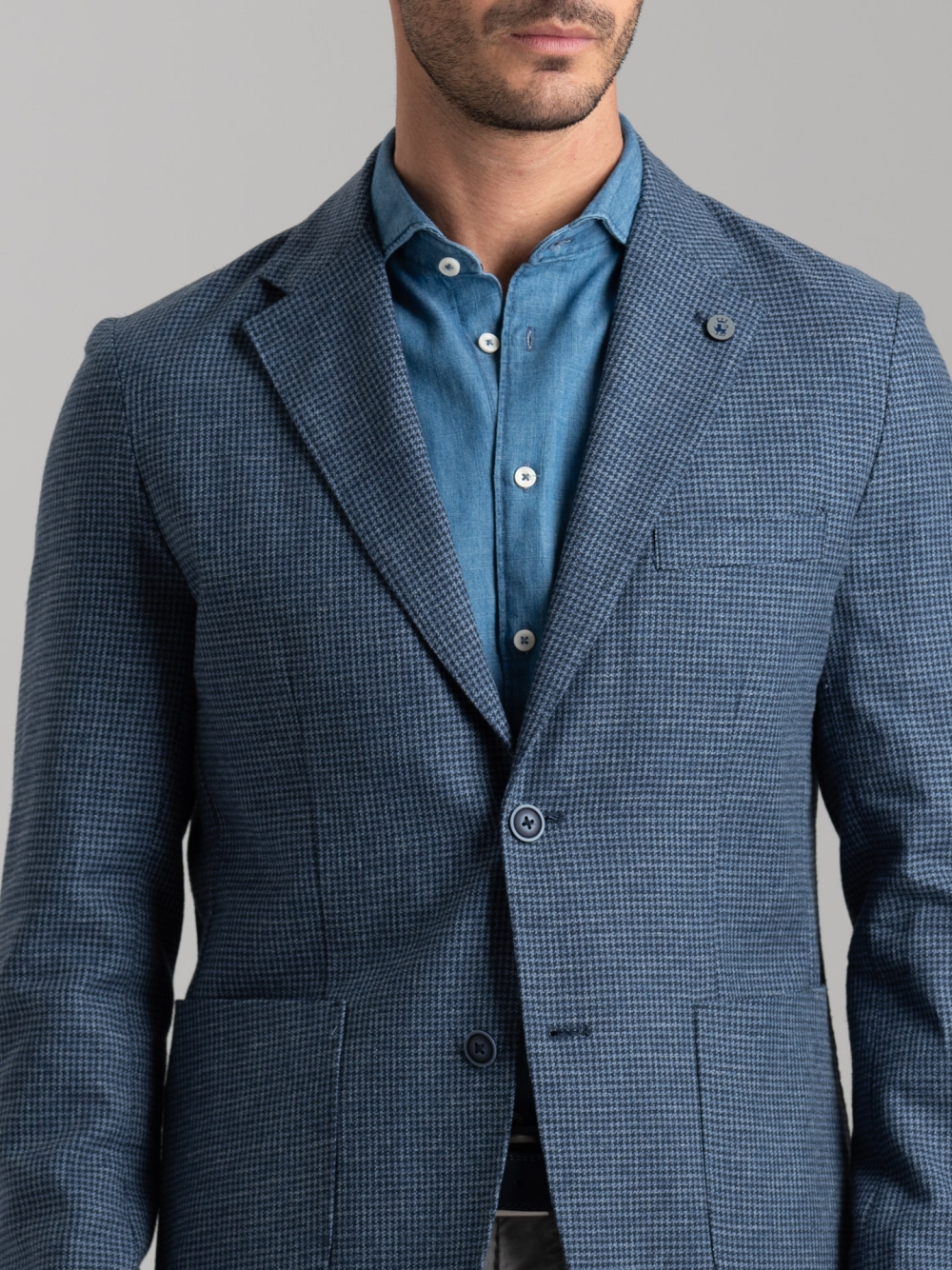 Giacca uomo dal design leggero e informale, realizzata in tessuto misto lino con fantasia micro quadretto blu. È caratterizzata da tasche applicate sul davanti, chiusura a due bottoni e spilletta decorativa. La costruzione destrutturata e sfoderata la rende ideale per outfit uomo casual.