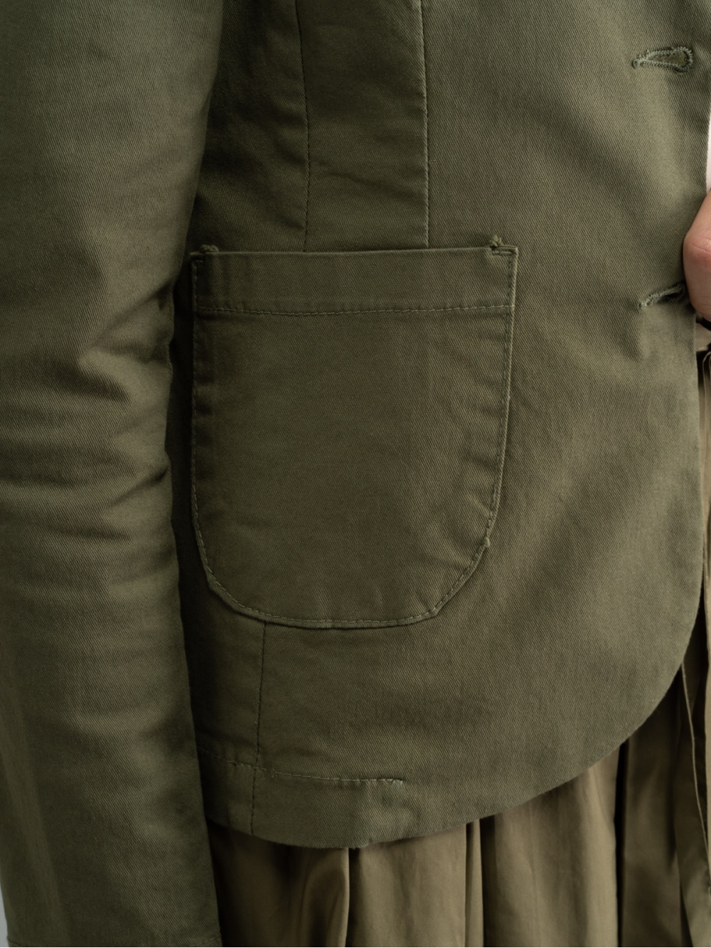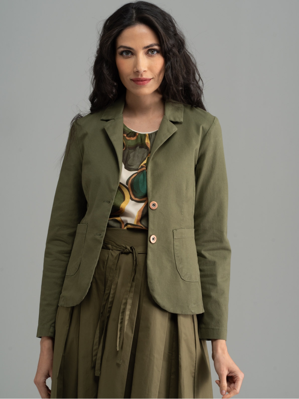 Giacca donna realizzata in tessuto gabardina di cotone stretch tinto capo verde militare, caratterizzata da una linea sciancrata a due bottoni e uno stile più informale.