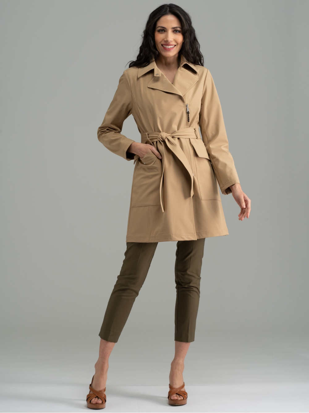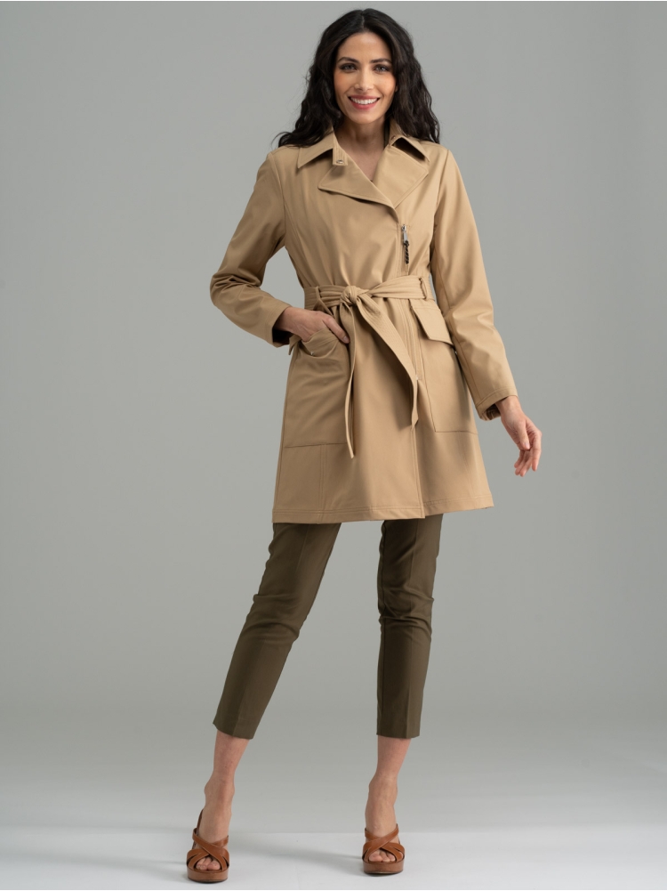 Trench donna in tessuto tecnico stretch caratterizzato da zip di chiusura tono su tono rovesciata, tasche applicate sul davanti e cintura impunturata.