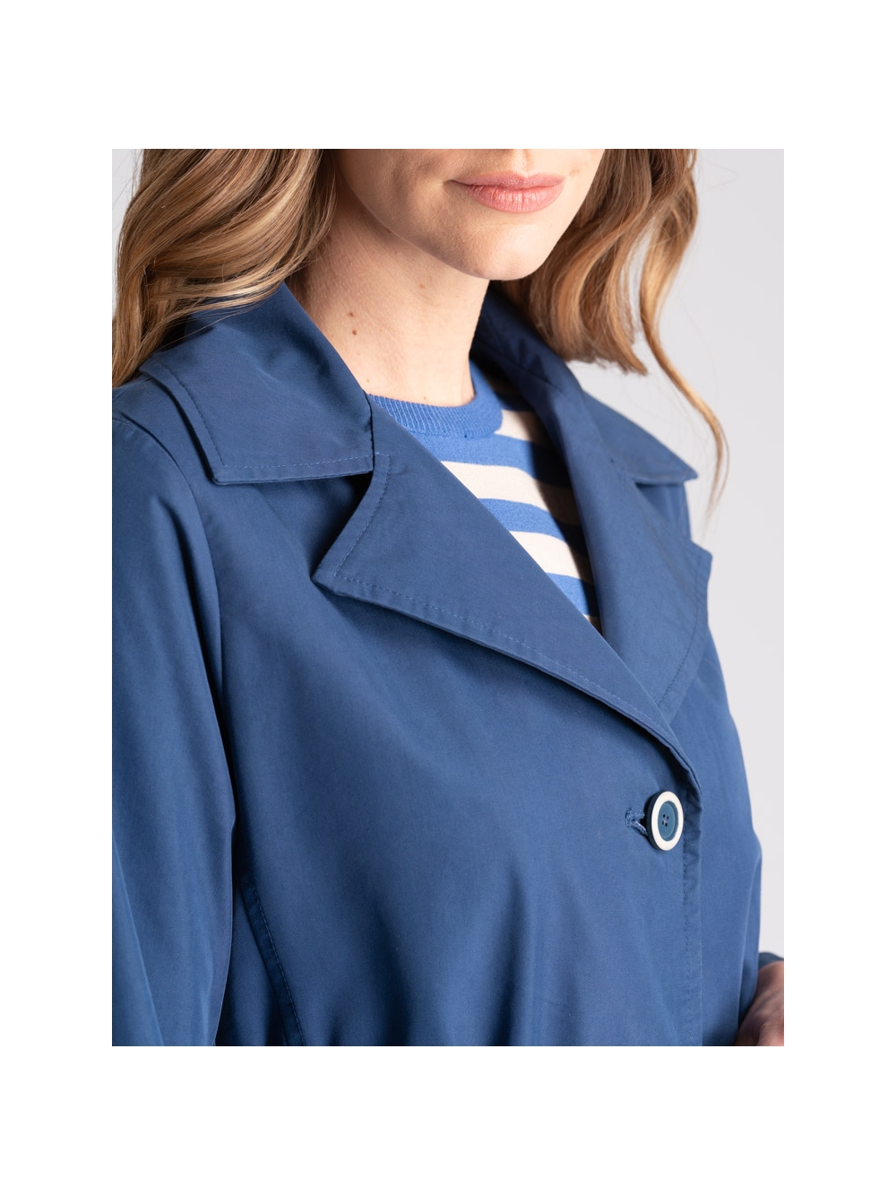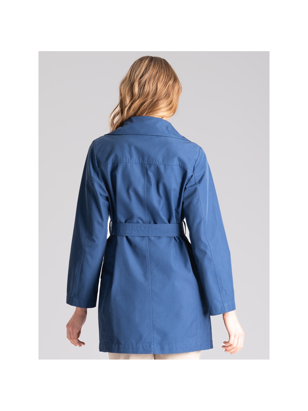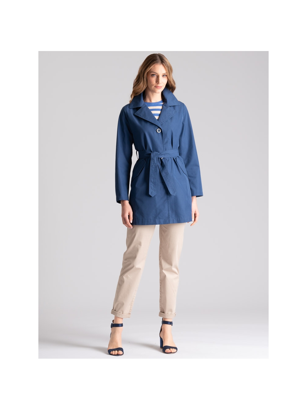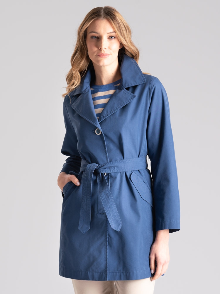 Spolverino donna sfoderato, monopetto con cintura e tasche, realizzato in policotone e disponibile nelle varianti colore blu e beige.