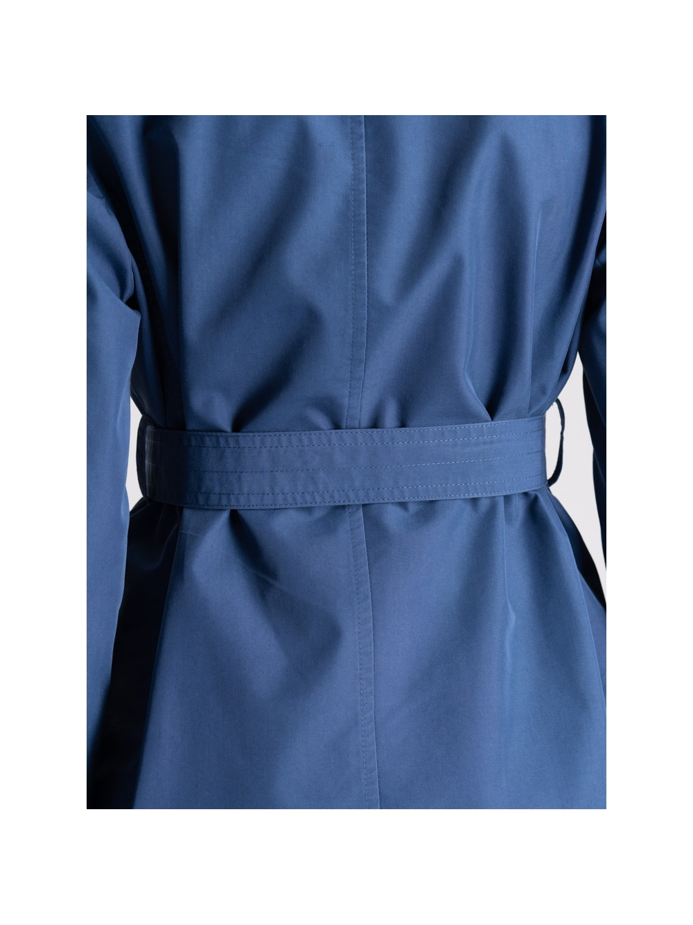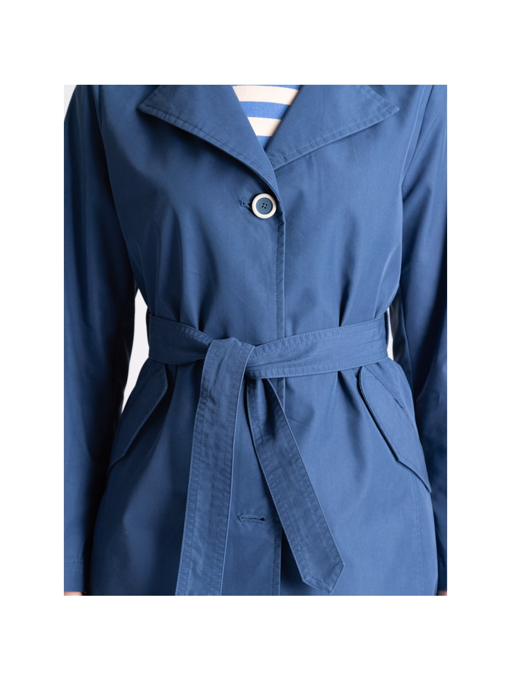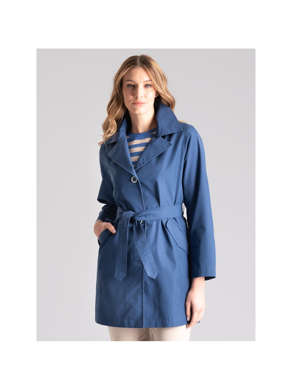 Spolverino donna sfoderato, monopetto con cintura e tasche, realizzato in policotone e disponibile nelle varianti colore blu e beige.