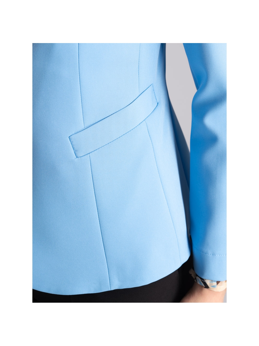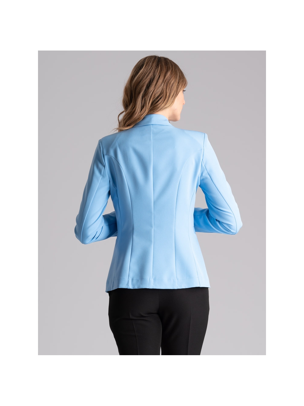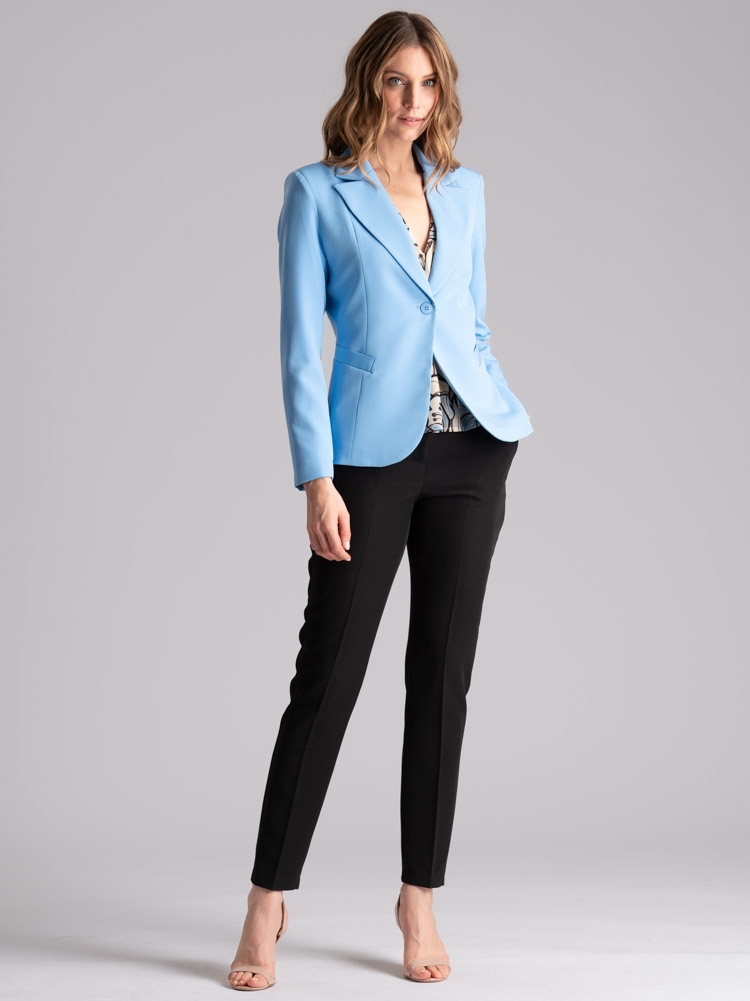 Giacca donna sfoderata con revers a lancia, dalla linea sciancrata, realizzata in tessuto bistretch nelle varianti azzurro e sabbia.