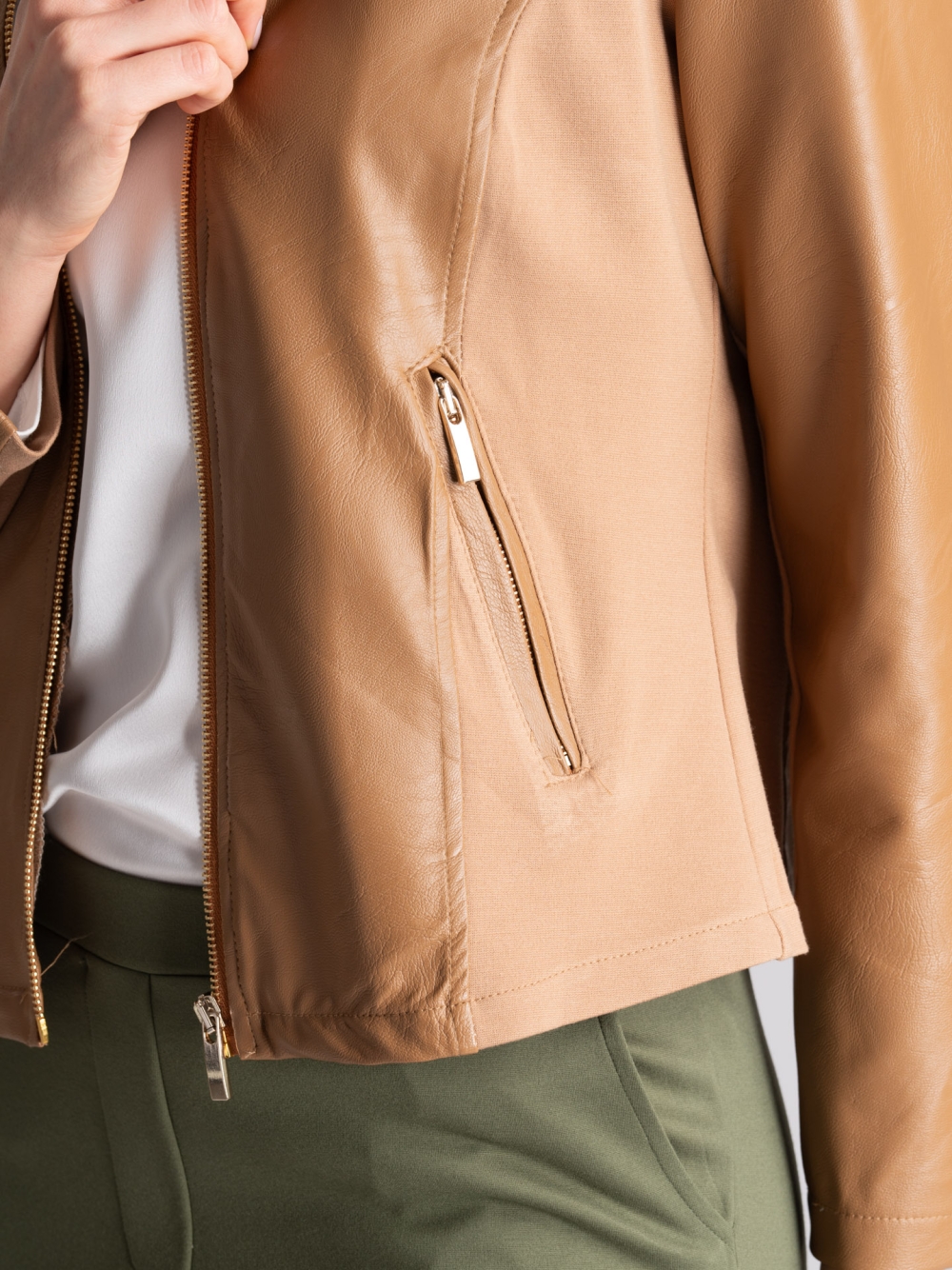 Giubbino donna girocollo con zip sulla chiusura e le tasche, realizzato in ecopelle di alta qualità e inserti in tessuto Punto Milano sul fianco e la mezza manica per dare una vestibilità confortevole. Disponibile nelle varianti colore nero e cammello.