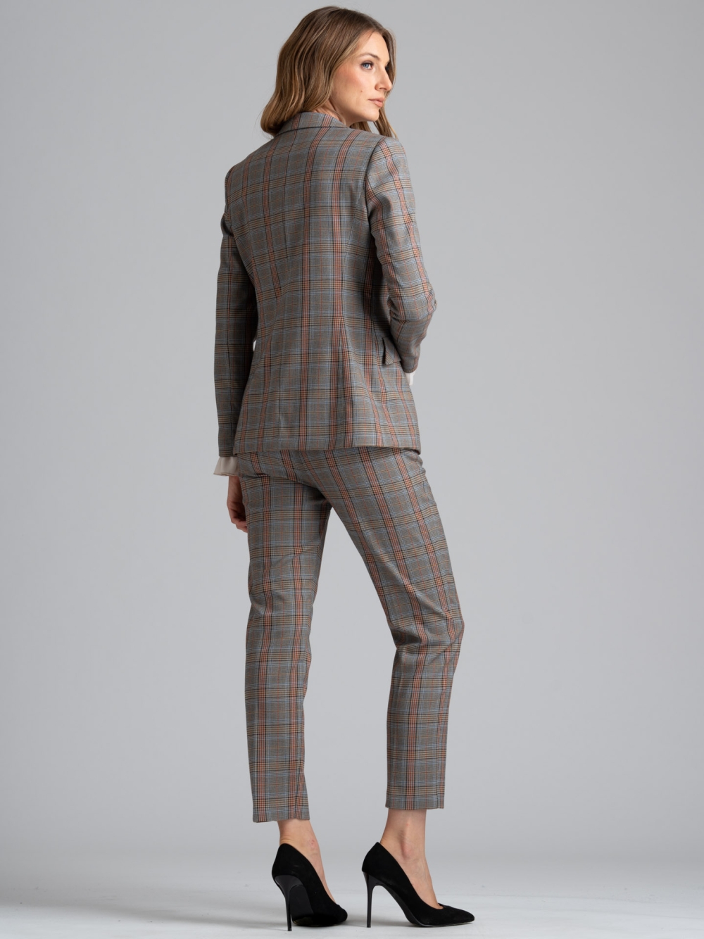 Giacca donna medio lunga realizzata in tessuto fantasia madras su base grigio, con fodera interna in colore a contrasto. Il modello a un bottone presenta revers a lancia e tasche con aletta. Questo modello può essere abbinato al gilet e ai pantaloni dello stesso tessuto per creare un completo donna da ufficio elegante e contemporaneo.