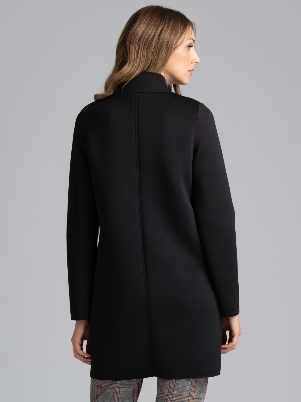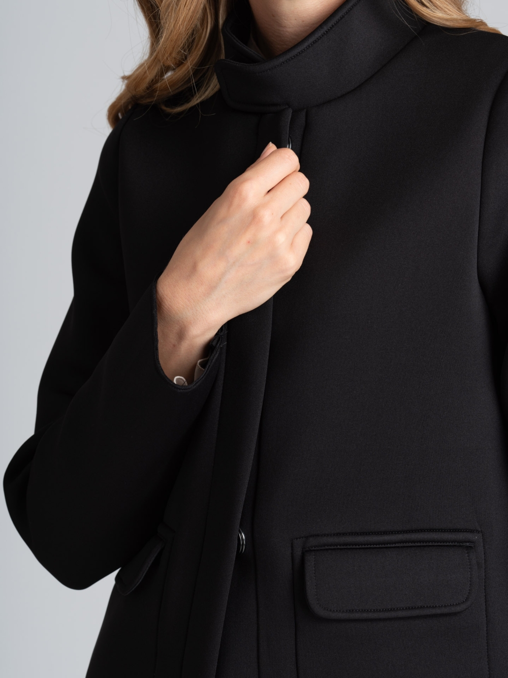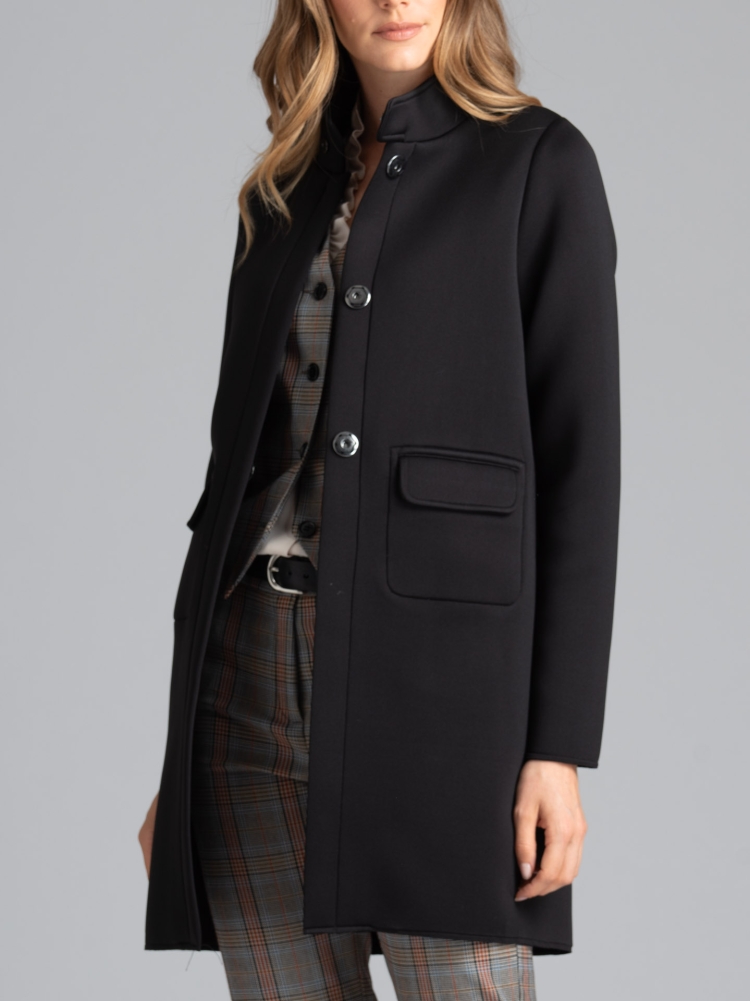 Cappottino donna con collo in piedi e chiusura con maxi bottoni automatici cuciti a mano, realizzato in tessuto scuba sfoderato.