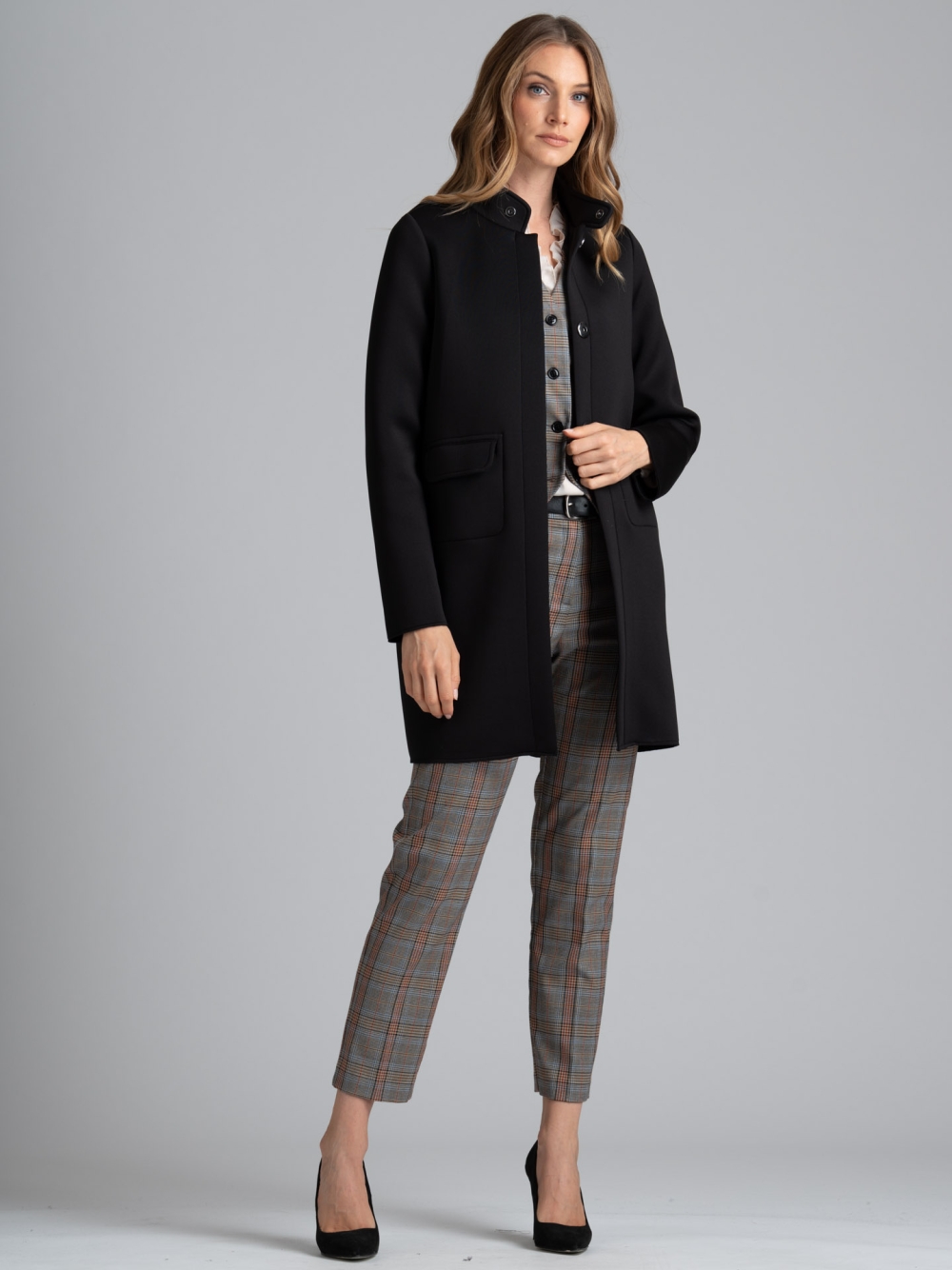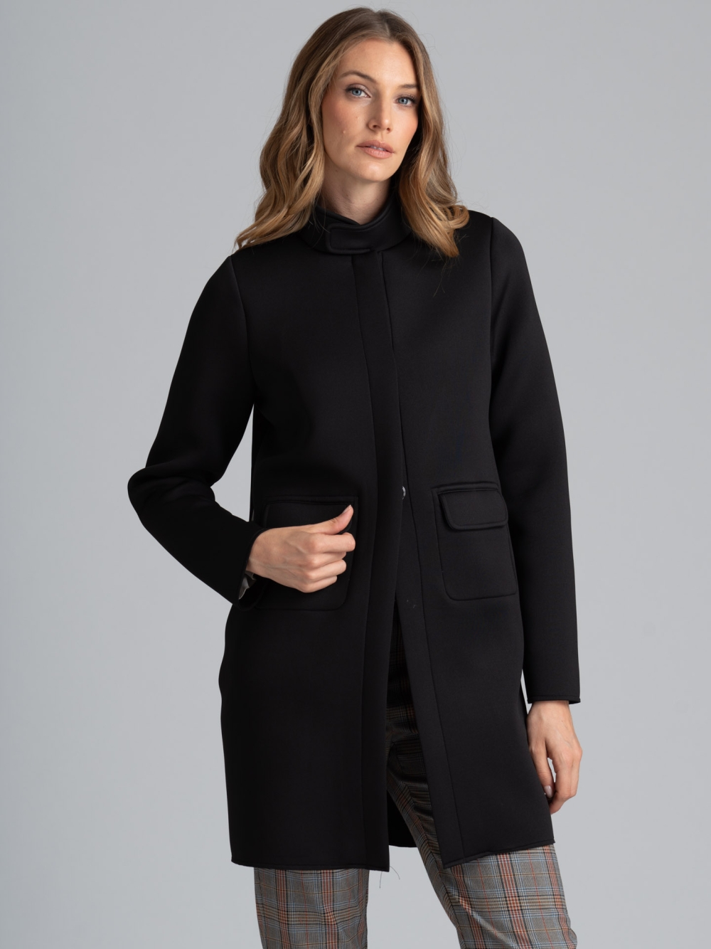 Cappottino donna realizzato in tessuto scuba sfoderato e bordato caratterizzato da un elegante collo in piedi e chiusura con maxi bottoni automatici cuciti a mano. Il capo presenta particolari con taglio vivo, micro taschine decorative sul davanti, tasche di servizio sul fianco chiuse da zip invisibili personalizzate. Questo cappottino è disponibile nelle varianti colore nero e cammello.
