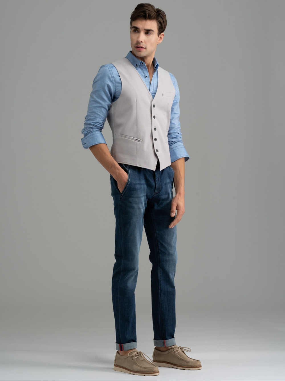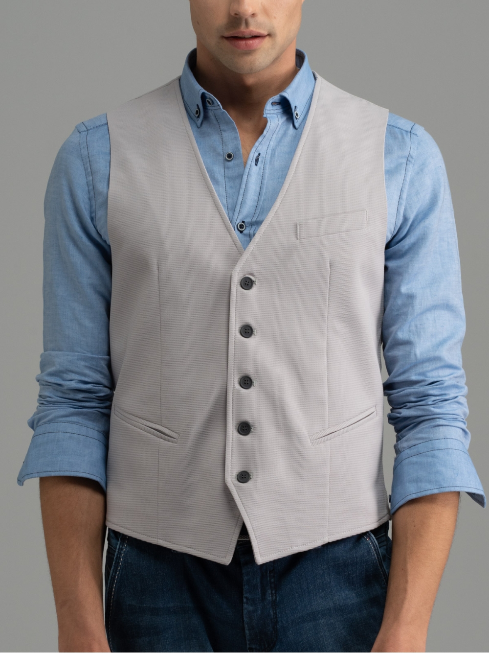 Abbinato alla giacca, il gilet uomo in tessuto armaturato elastico a micro nido d’ape, è disponibile nei colori grigio e blu chiaro. Sul retro presenta un laccetto regolabile per una silhouette più comoda o più aderente.