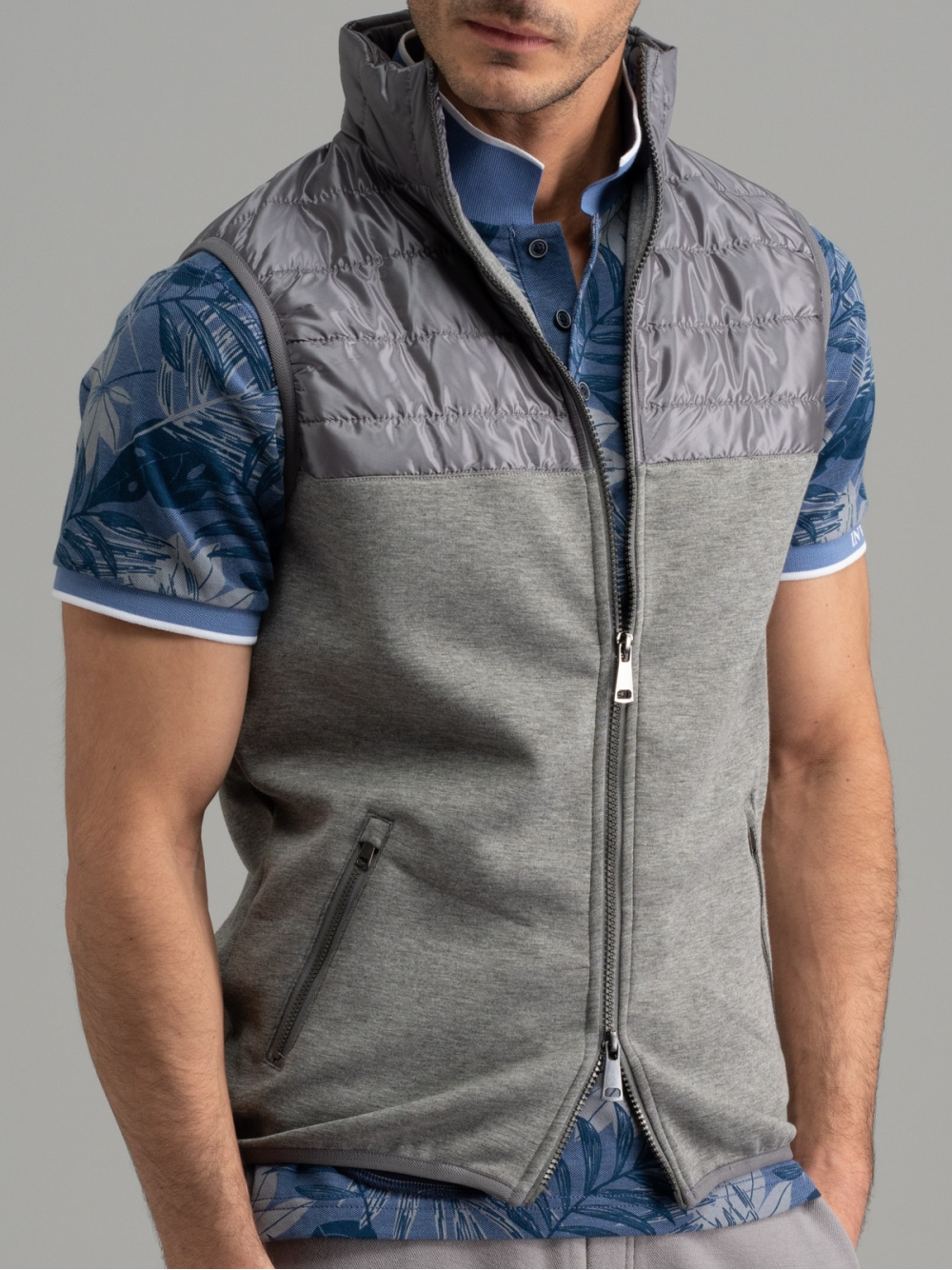 Gilet uomo in tessuto Scuba con interno a contrasto e inserti imbottiti in tessuto poliestere che grazie alla particolare armatura con fili a due toni di colore, crea un effetto luminoso. All’interno il gilet è finito con un tessuto Scuba di colore a contrasto. Un capo semplice ma ricco di dettagli, per uno stile moderno e frizzante.