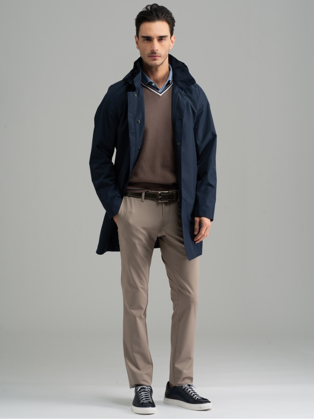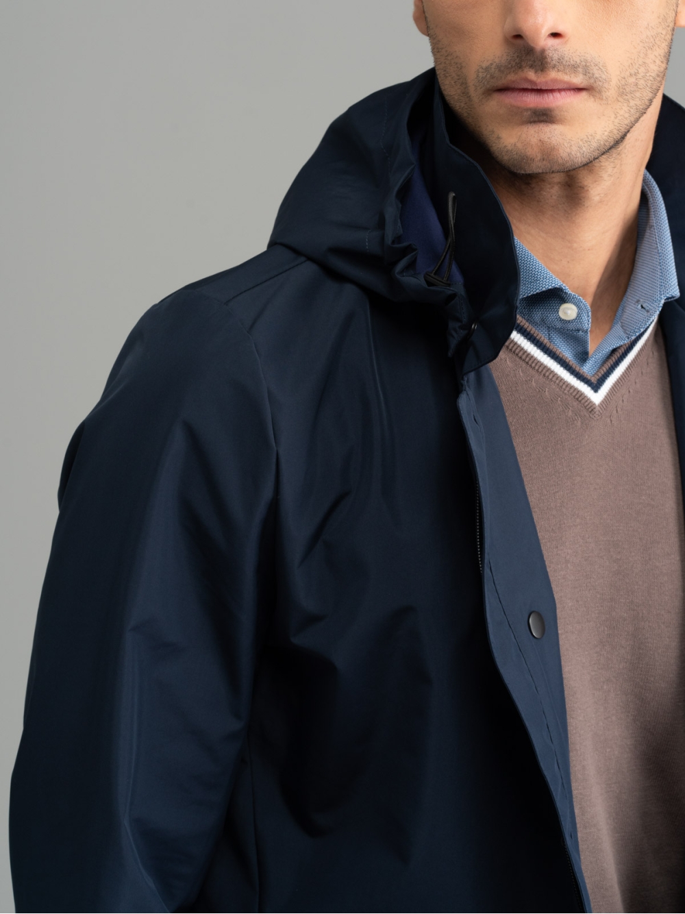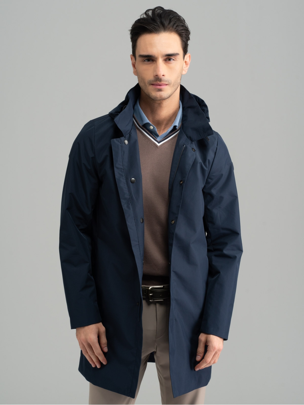 Spolverino uomo in tessuto liscio con cappuccio staccabile, zip antiacqua al rovescio che garantisce protezione e tasche interne applicate.