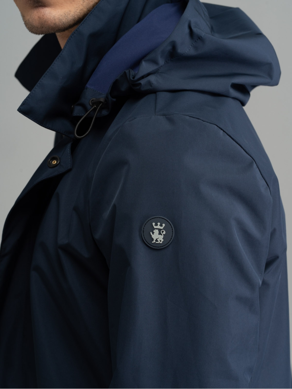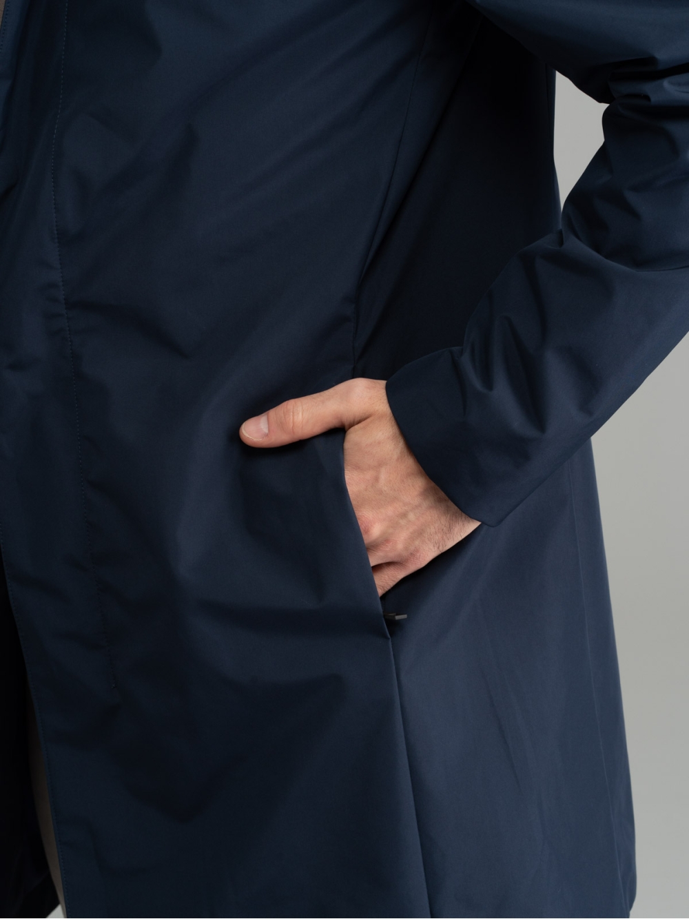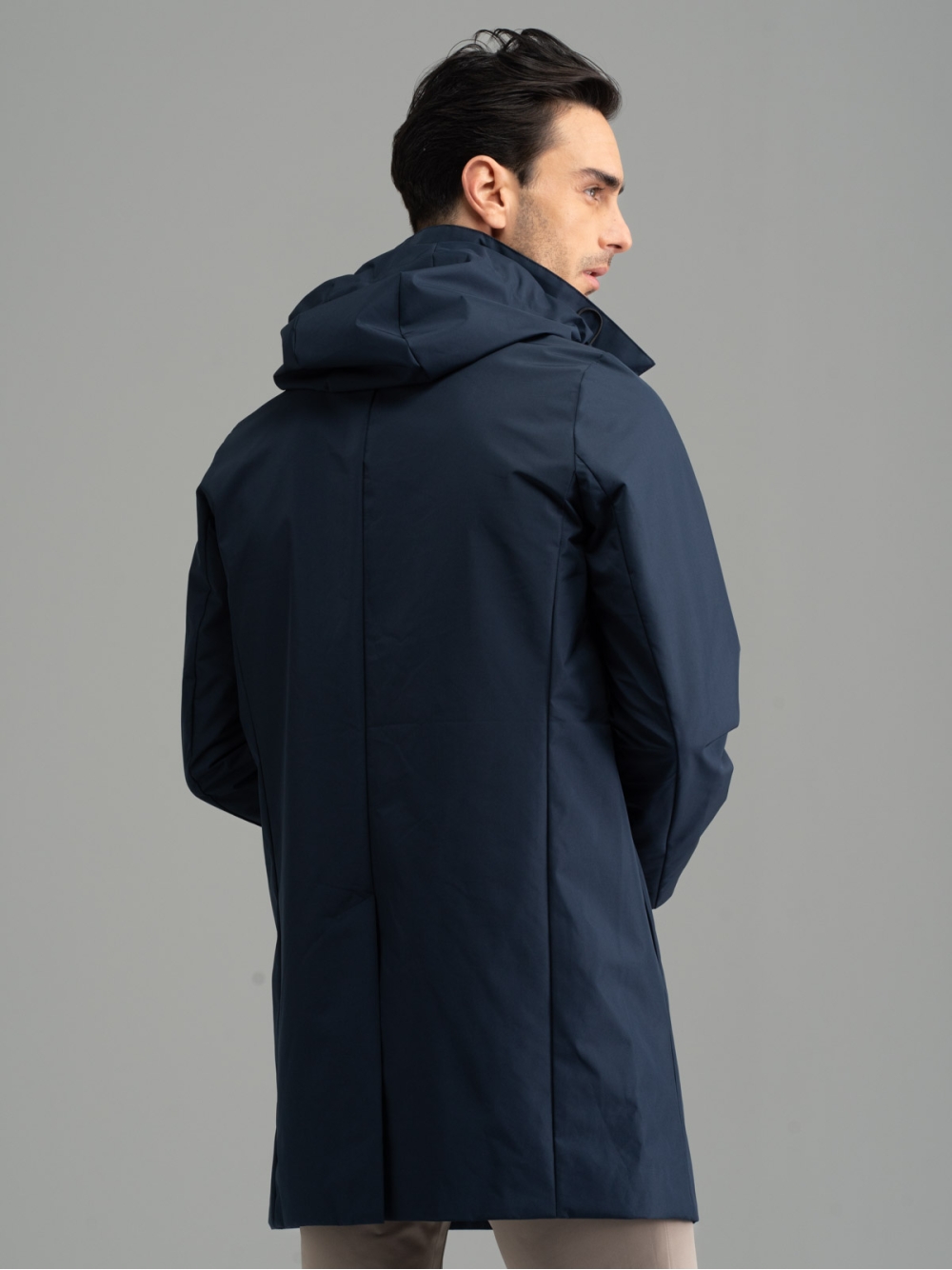 Spolverino uomo in tessuto liscio con cappuccio staccabile, zip antiacqua al rovescio che garantisce protezione e tasche interne applicate.