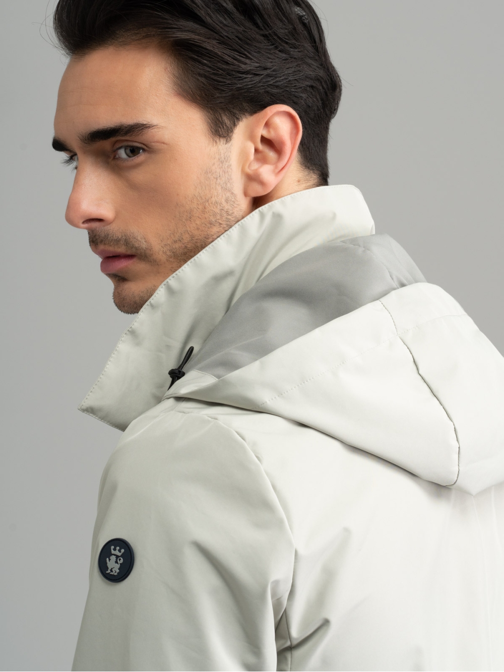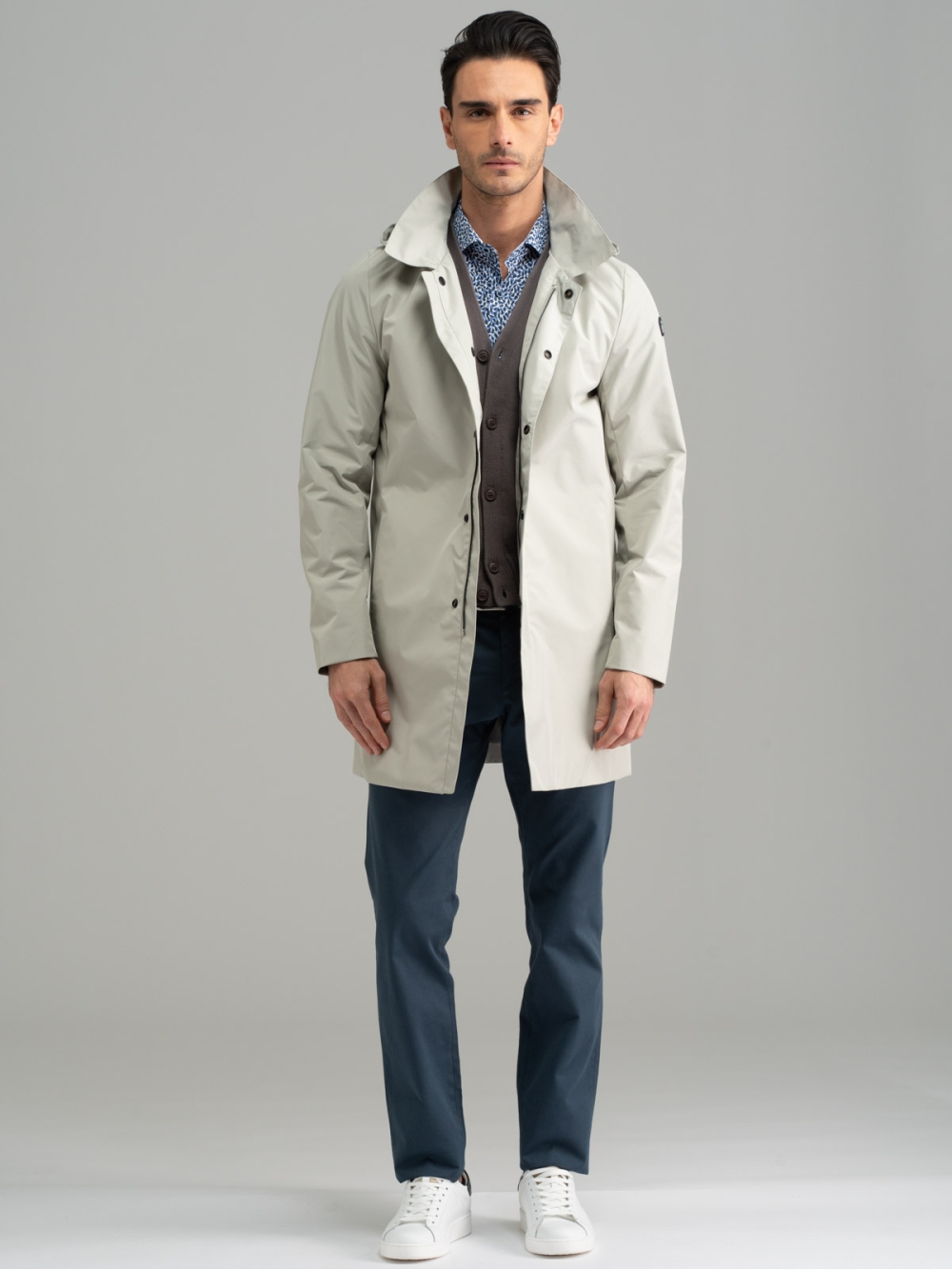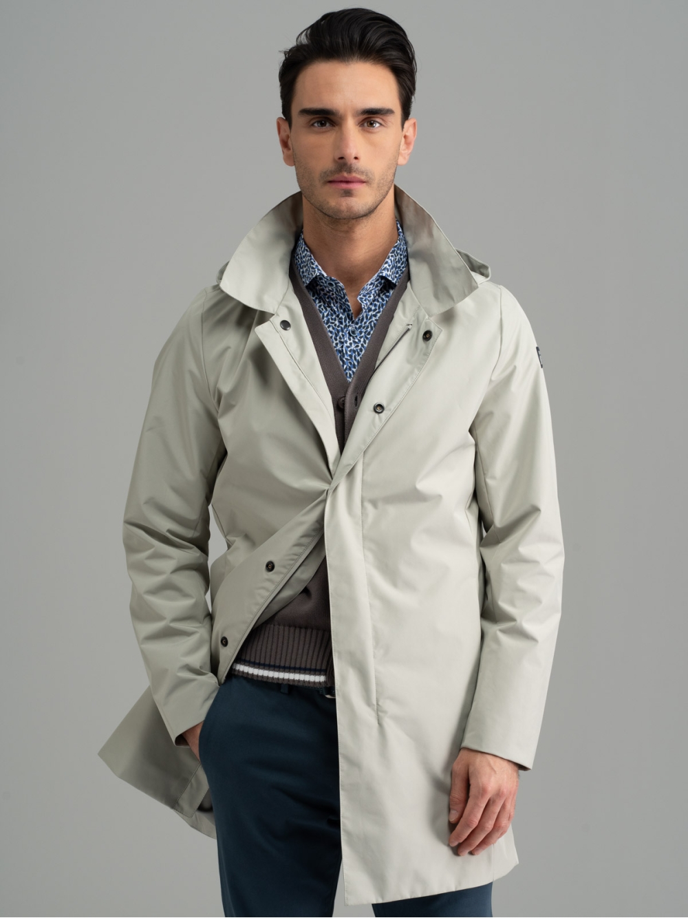 Spolverino uomo in tessuto liscio con cappuccio staccabile, zip antiacqua al rovescio che garantisce protezione e tasche interne applicate.