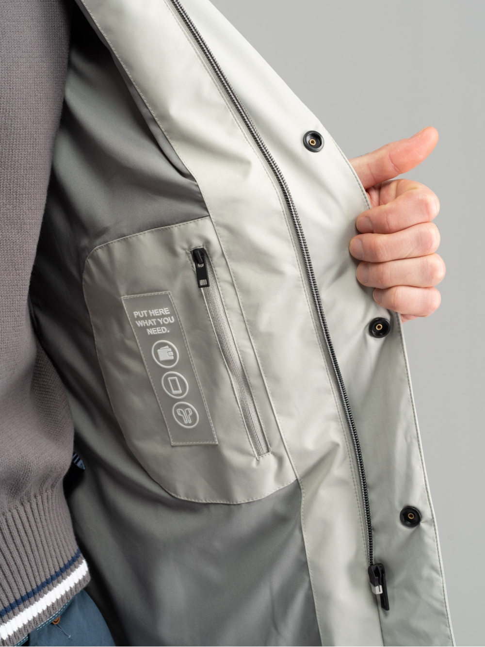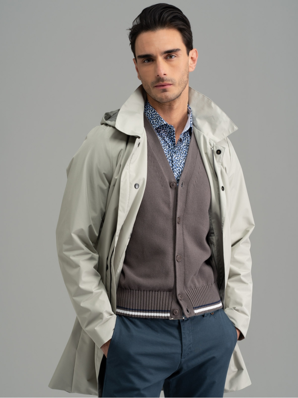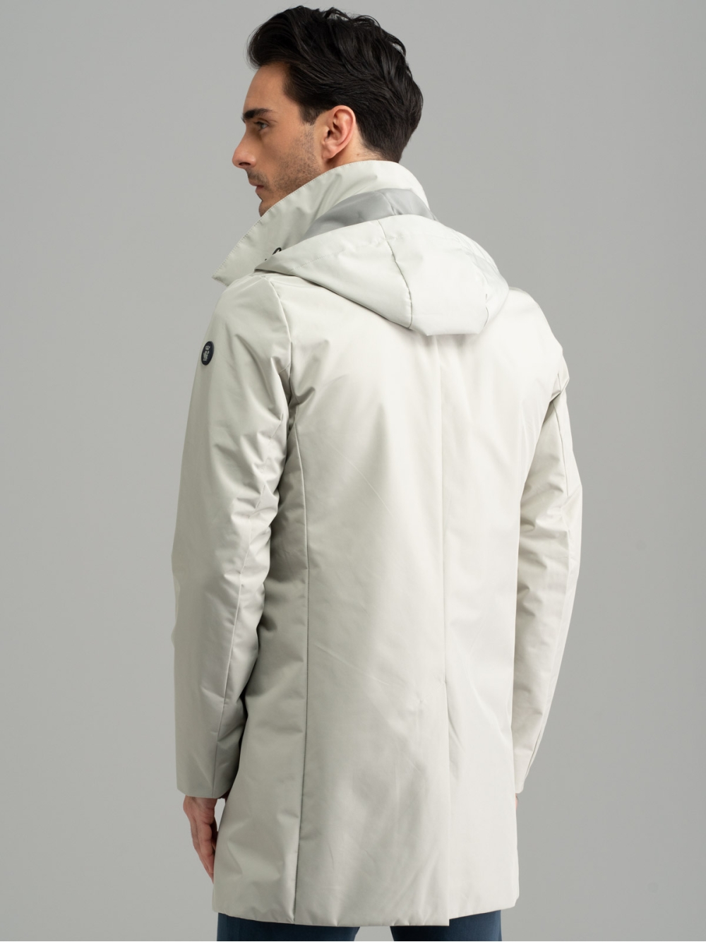 Spolverino uomo in tessuto liscio con cappuccio staccabile, zip antiacqua al rovescio che garantisce protezione e tasche interne applicate.