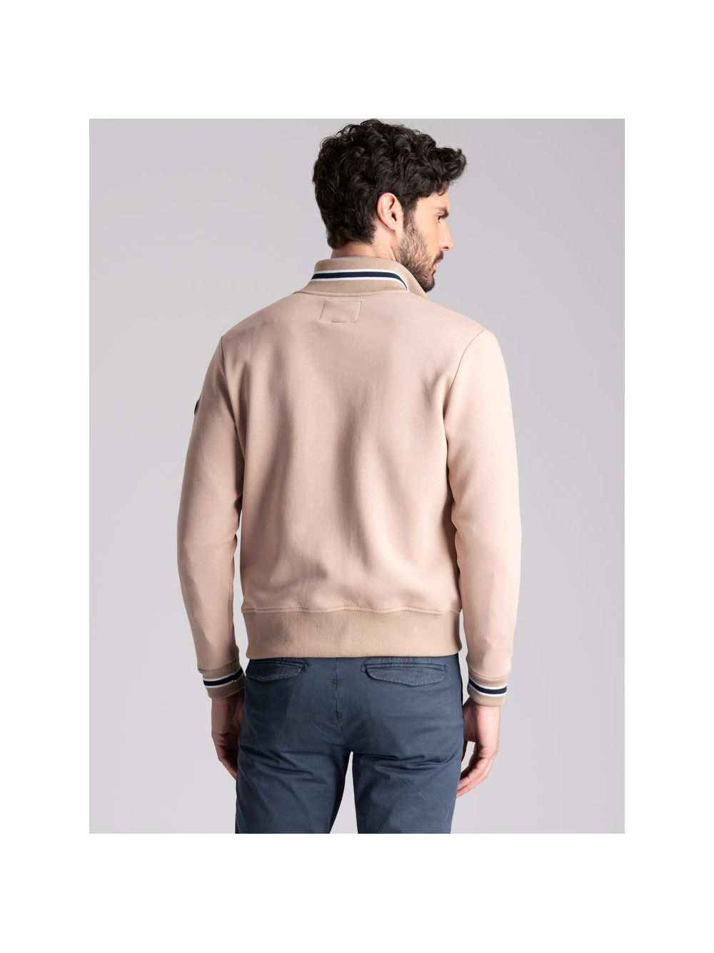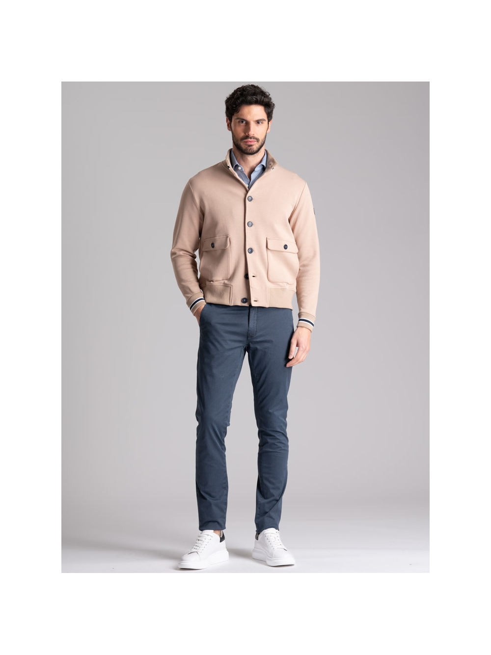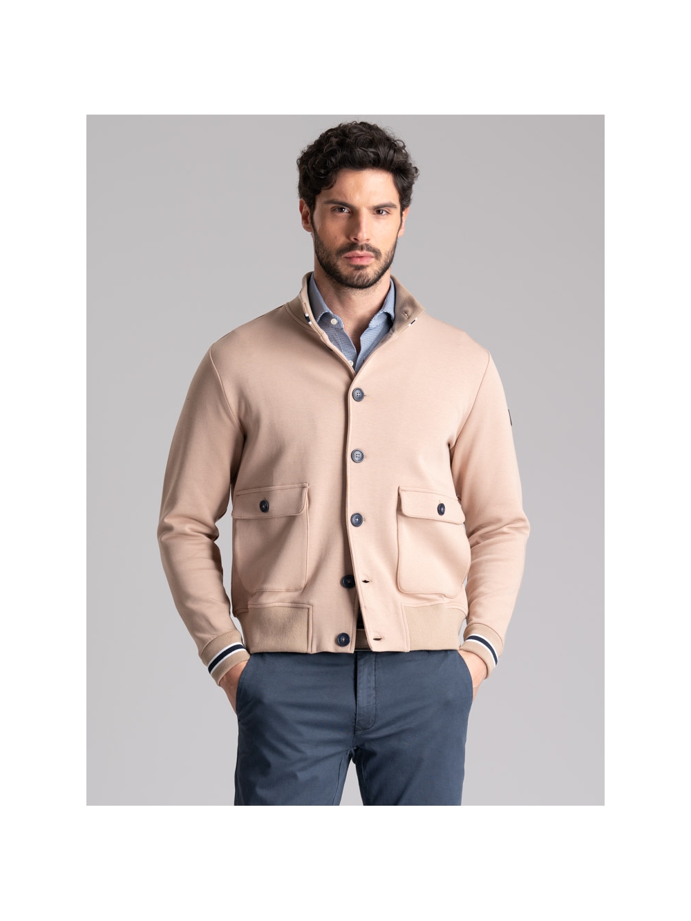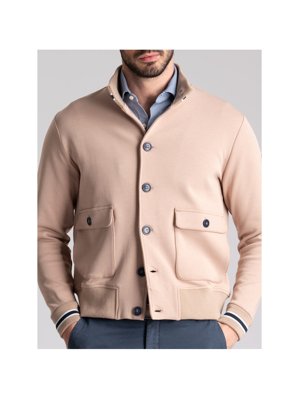 Bomber uomo realizzato in Jersey di tessuto tecnico accoppiato di qualità, disponibile nelle varianti colore blu e cachi. Questo giubbino uomo presenta una chiusura con bottoni, tasche laterali applicate con entrata anche laterale, rib sul collo in piedi e polsi con contrasti colore, interno sfoderato di colore a contrasto. Il modello bomber e i colori di questo capo sono un richiamo allo stile preppy di ispirazione college, adatto ad un abbigliamento uomo casual e una moda giovanile.